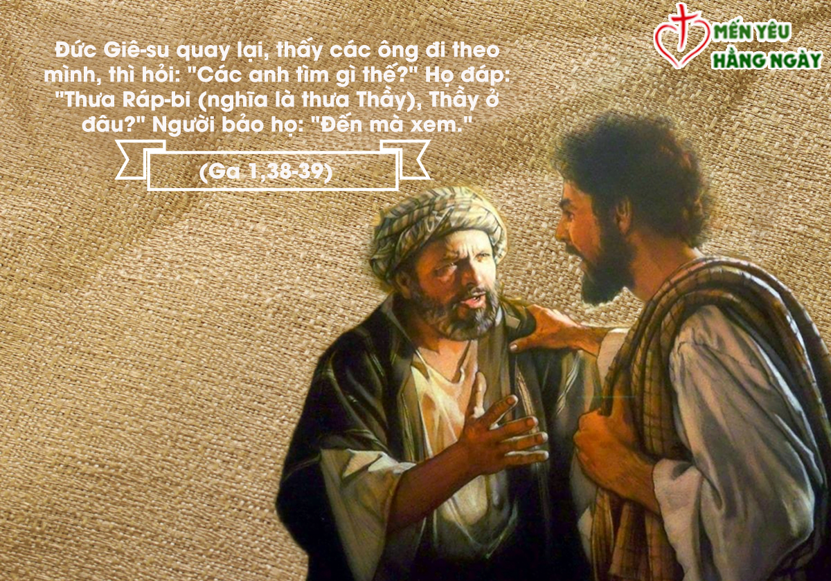 Hôm sau, ông Gio-an lại đang đứng với hai người trong nhóm môn đệ của ông. Thấy Đức Giê-su đi ngang qua, ông lên tiếng nói: “Đây là Chiên Thiên Chúa.” Hai môn đệ nghe ông nói, liền đi theo Đức Giê-su. Đức Giê-su quay lại, thấy các ông đi theo mình, thì hỏi: “Các anh tìm gì thế?” Họ đáp: “Thưa Ráp-bi (nghĩa là thưa Thầy), Thầy ở đâu?” Người bảo họ: “Đến mà xem.” Họ đã đến xem chỗ Người ở, và ở lại với Người ngày hôm ấy. Lúc đó vào khoảng giờ thứ mười.