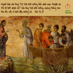 Người bảo các ông: “Cứ thả lưới xuống bên phải mạn thuyền đi, thì sẽ bắt được cá”. Các ông thả lưới xuống, nhưng không sao kéo lên nổi, vì lưới đầy những cá. (Gio-an 21,6)