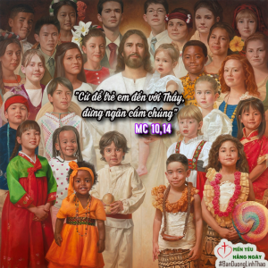 “Hãy để trẻ em đến với thầy, đừng ngăn cản chúng, vì Nước Trời thuộc về những ai giống như chúng. Amen, Thầy bảo thật anh em, phàm ai không đón nhận Nước Trời với tâm hồn thơ trẻ sẽ không được vào”. Rồi Người ôm lấy các trẻ và chúc lành cho chúng, Ngài đặt tay lên chúng.”