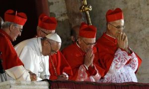 Newly elected Pope Francis (2nd L) appears on the balcony of St. Peter’s Basilica after being elected by the conclave of cardinals, at the Vatican, March 13, 2013. Pope Francis, the former Cardinal Jorge Bergoglio of Argentina, delivered his first blessing to a huge crowd in St Peter’s Square on Wednesday night, asking for the prayers of “all men and women of good will” to help him lead the Catholic Church. REUTERS/Alessandro Bianchi (VATICAN – Tags: RELIGION) ORG XMIT: PDH808