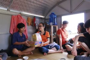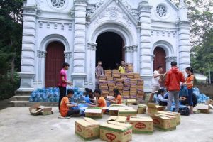 Điểm dừng chân đầu tiên của đoàn là giáo xứ Phúc Địa, giáo hạt Hữu Lễ, nằm trên địa bàn Thọ Xuân, Thanh Hóa. Đúng 11h30, đoàn có mặt tại giáo xứ Phúc Địa. Sau những phút nghỉ ngơi và ăn trưa, anh chị em ngồi lại với nhau đóng gói những phần quà. Đó là những suất lương thực giúp bà con phần nào chống đói trong những ngày nước lũ chưa rút.