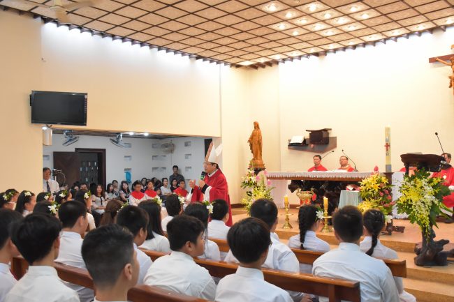 Ngài ban Bí tích Thêm sức cho các em với các nghi thức: Tuyên xưng đức tin, Đặt tay cầu nguyện và Xức dầu.