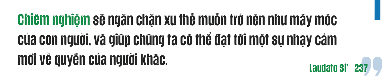 Ai trong chúng ta muốn sử dụng những thuật ngữ như vậy thì nên lắng nghe suy nghĩ của Đức Giáo hoàng Phanxicô về hiện tượng “sống vội”. Đây là một trạng huống đòi hỏi chúng ta phải chấp nhận giới hạn của chính mình. Nó đòi hỏi một sự lắng đọng trong thái độ tôn trọng và khiêm nhường, kết hợp với sự nhạy bén trước những cơ hội có thể mở ra cho việc đối thoại. Thực tế là đôi khi sự chia rẽ sâu sắc lại được vượt qua trong những cuộc gặp gỡ và khoảnh khắc không ngờ tới. Sự ưu ái dành cho vấn đề tâm linh và nhu cầu hoán cải cá nhân trong Laudato Si’ không phải là sự thoái lui trước những thách thức mang tính toàn cầu. Để đối mặt với thách thức đó một cách hiệu quả, chúng ta sẽ phải tiếp cận chính động lực thâm sâu nhất nơi lòng mình.