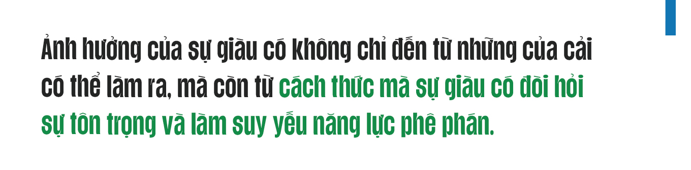 Bất kỳ ai thách thức quan điểm của họ về mọi thứ đều bị coi là không đáng tin cậy. Điều này cho thấy không phải vì họ không trung thực, mà vì họ không nắm bắt được thực tế. Ngược lại, vì họ biết cách kiếm tiền, họ tự cho mình là biết tất cả những gì cần biết. Nhà kinh tế học người Canada, J.K. Galbraith, rất quen thuộc với bản chất ảo tưởng của những thái độ như vậy khi ông nói về một loại “ấn tượng công khai thường thấy khi cho rằng trí thông minh… song hành chặt chẽ với việc sở hữu tiền bạc”. [2] Ảnh hưởng của sự giàu có không chỉ đến từ những của cải có thể làm ra, mà còn từ cách thức mà sự giàu có đòi hỏi sự tôn trọng và làm suy yếu năng lực phê phán.