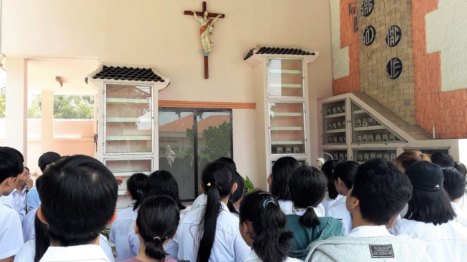 Trước khi lên đường, các em bắt đầu Thánh lễ tại Nhà nguyện Học viện Dòng Tên, rồi được cha chánh xứ dặn dò đôi điều.