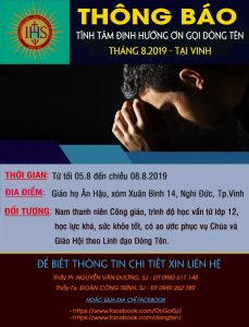 Xin mời đến cùng chúng tôi, trong khóa Tĩnh Tâm Định Hướng tháng 8.2019 tại Giáo họ Ân Hậu, Nghi Đức, TP. Vinh, từ tối ngày 05 – 08.8.2019.