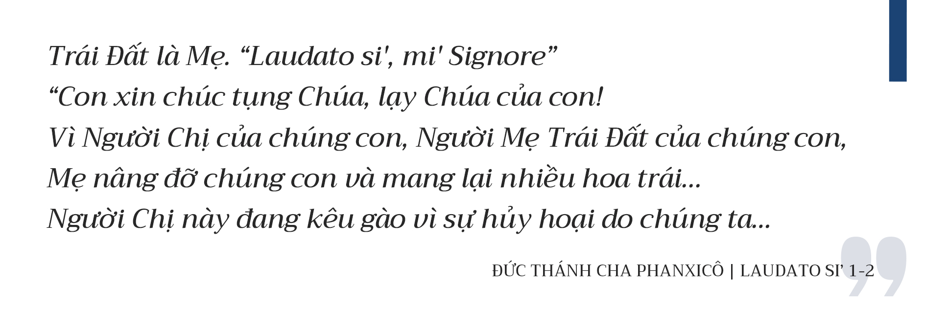 Điều này cho phép chúng ta nhớ lại rằng Trái Đất là mẹ. “Laudato si’, mi’ Signore, “Con xin chúc tụng Chúa, lạy Chúa của con! Vì Người Chị của chúng con, Người Mẹ Trái Đất của chúng con, Mẹ nâng đỡ chúng con và mang lại nhiều hoa trái… Người Chị này đang kêu gào vì sự hủy hoại do chúng ta…” (LS 1-2). Và điều này không phải là Thời Đại Mới, không rơi vào các thuật ngữ ẩn dụ.