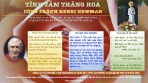 Xin kính mời mọi người cùng tham dự tĩnh tâm tháng hoa với thánh Henri Newman, ngài là người Anh, học giả và mục sư tin lành có ảnh hưởng lớn. Năm 1845 trở lại Công Giáo, và là viện trưởng Đại Học Công Giáo ở Dublin, Ái-Nhĩ-Lan. Được coi là Giáo Phụ thời đại. Năm 1879 được vinh thăng hồng y với khẩu hiệu: cor ad cor loquitur – Trái tim nói với trái tim. Hiển Thánh ngày 13.10.2019.