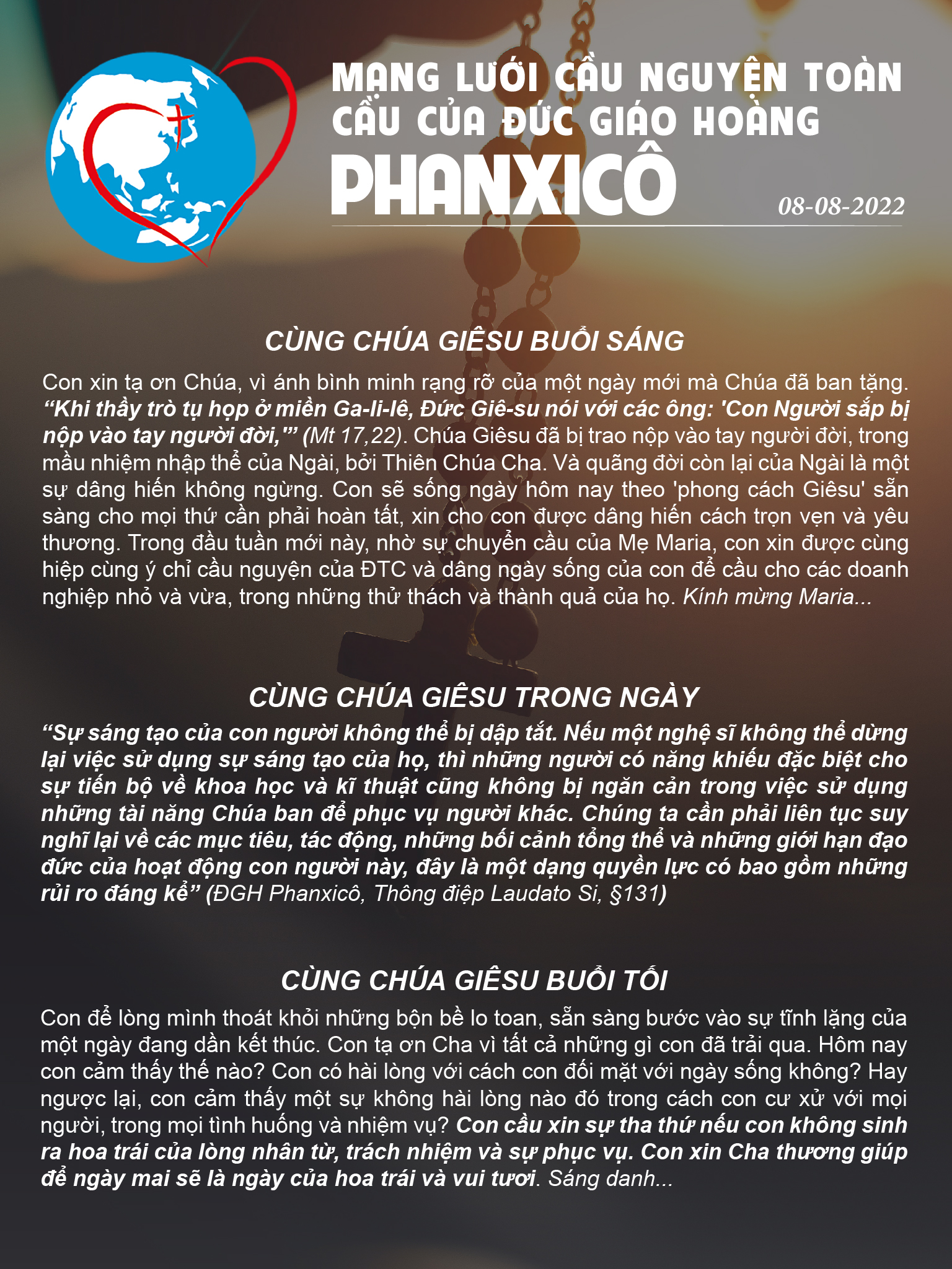 Con xin tạ ơn Chúa, vì ánh bình minh rạng rỡ của một ngày mới mà Chúa đã ban tặng. “Khi thầy trò tụ họp ở miền Ga-li-lê, Đức Giê-su nói với các ông: ‘Con Người sắp bị nộp vào tay người đời,’” (Mt 17,22). Chúa Giêsu đã bị trao nộp vào tay người đời, trong mầu nhiệm nhập thể của Ngài, bởi Thiên Chúa Cha. Và quãng đời còn lại của Ngài là một sự dâng hiến không ngừng. Con sẽ sống ngày hôm nay theo ‘phong cách Giêsu’ sẵn sàng cho mọi thứ cần phải hoàn tất, xin cho con được dâng hiến cách trọn vẹn và yêu thương. Trong đầu tuần mới này, nhờ sự chuyển cầu của Mẹ Maria, con xin được cùng hiệp cùng ý chỉ cầu nguyện của ĐTC và dâng ngày sống của con để cầu cho các doanh nghiệp nhỏ và vừa, trong những thử thách và thành quả của họ. Kính mừng Maria…