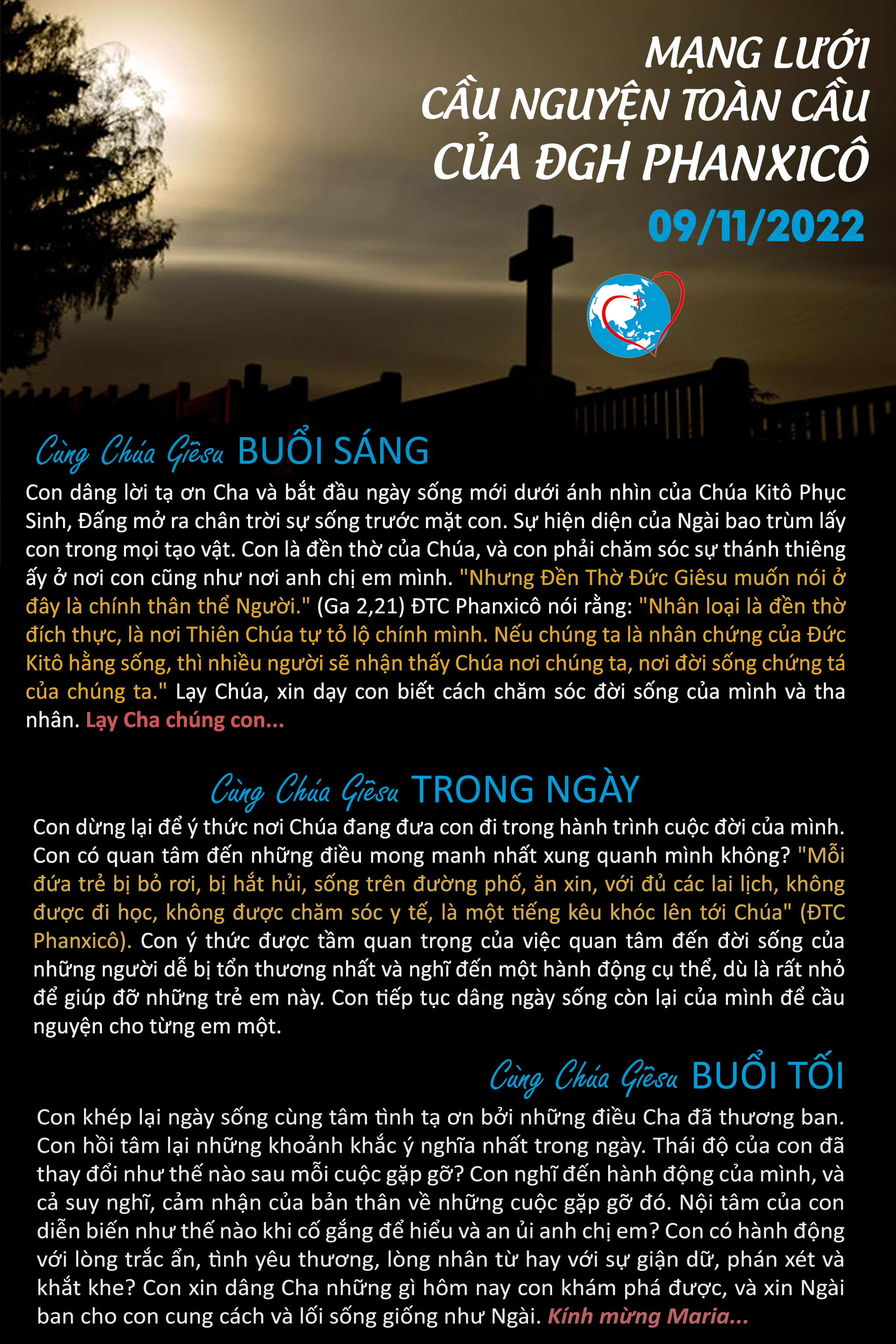 Con dừng lại để ý thức nơi Chúa đang đưa con đi trong hành trình cuộc đời của mình. Con có quan tâm đến những điều mong manh nhất xung quanh mình không? “Mỗi đứa trẻ bị bỏ rơi, bị hắt hủi, sống trên đường phố, ăn xin, với đủ các lai lịch, không được đi học, không được chăm sóc y tế, là một tiếng kêu khóc lên tới Chúa” (ĐTC Phanxicô). Con ý thức được tầm quan trọng của việc quan tâm đến đời sống của những người dễ bị tổn thương nhất và nghĩ đến một hành động cụ thể, dù là rất nhỏ để giúp đỡ những trẻ em này. Con tiếp tục dâng ngày sống còn lại của mình để cầu nguyện cho từng em một.