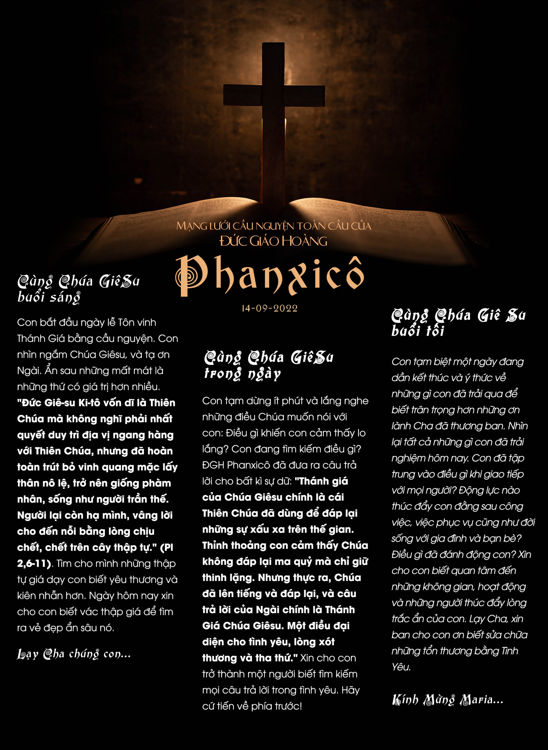 Con bắt đầu ngày lễ Tôn vinh Thánh Giá bằng cầu nguyện. Con nhìn ngắm Chúa Giêsu, và tạ ơn Ngài. Ẩn sau những mất mát là những thứ có giá trị hơn nhiều. “Đức Giê-su Ki-tô vốn dĩ là Thiên Chúa mà không nghĩ phải nhất quyết duy trì địa vị ngang hàng với Thiên Chúa, nhưng đã hoàn toàn trút bỏ vinh quang mặc lấy thân nô lệ, trở nên giống phàm nhân, sống như người trần thế. Người lại còn hạ mình, vâng lời cho đến nỗi bằng lòng chịu chết, chết trên cây thập tự.” (Pl 2,6-11). Tìm cho mình những thập tự giá dạy con biết yêu thương và kiên nhẫn hơn. Ngày hôm nay xin cho con biết vác thập giá để tìm ra vẻ đẹp ẩn sâu nó. Lạy Cha chúng con…
