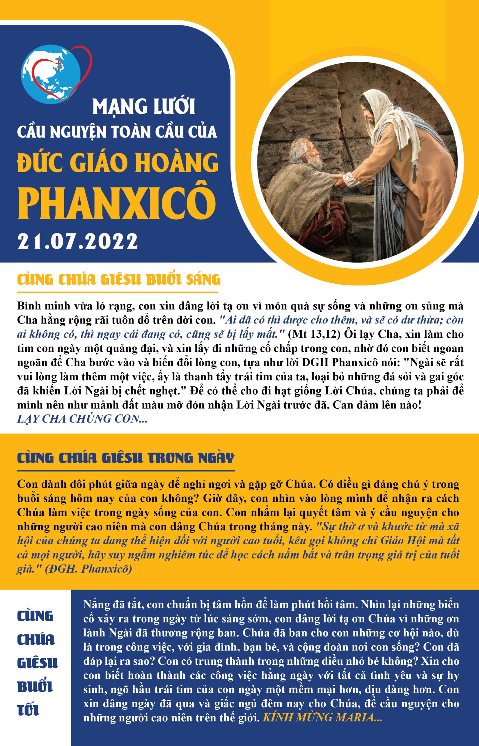 Con dành đôi phút giữa ngày để nghỉ ngơi và gặp gỡ Chúa. Có điều gì đáng chú ý trong buổi sáng hôm nay của con không? Giờ đây, con nhìn vào lòng mình để nhận ra cách Chúa làm việc trong ngày sống của con. Con nhẩm lại quyết tâm và ý cầu nguyện cho những người cao niên mà con dâng Chúa trong tháng này. “Sự thờ ơ và khước từ mà xã hội của chúng ta đang thể hiện đối với người cao tuổi, kêu gọi không chỉ Giáo Hội mà tất cả mọi người, hãy suy ngẫm nghiêm túc để học cách nắm bắt và trân trọng giá trị của tuổi già.” (ĐGH. Phanxicô)