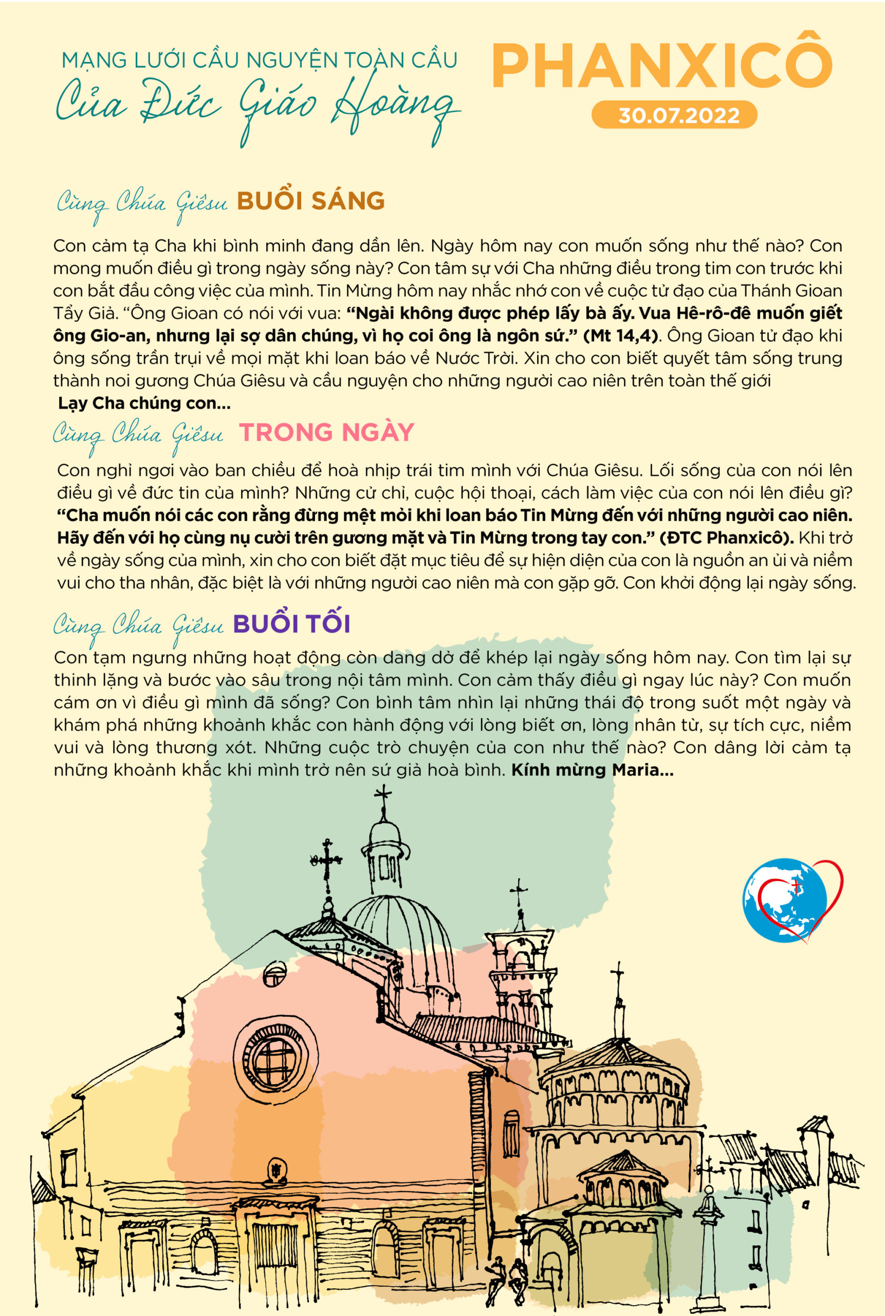 Con cảm tạ Cha khi bình minh đang dần lên. Ngày hôm nay con muốn sống như thế nào? Con mong muốn điều gì trong ngày sống này? Con tâm sự với Cha những điều trong tim con trước khi con bắt đầu công việc của mình. Tin Mừng hôm nay nhắc nhớ con về cuộc tử đạo của Thánh Gioan Tẩy Giả. “Ông Gioan có nói với vua: “Ngài không được phép lấy bà ấy. Vua Hê-rô-đê muốn giết ông Gio-an, nhưng lại sợ dân chúng, vì họ coi ông là ngôn sứ.” (Mt 14,4). Ông Gioan tử đạo khi ông sống trần trụi về mọi mặt khi loan báo về Nước Trời. Xin cho con biết quyết tâm sống trung thành noi gương Chúa Giêsu và cầu nguyện cho những người cao niên trên toàn thế giới. Lạy Cha chúng con…
