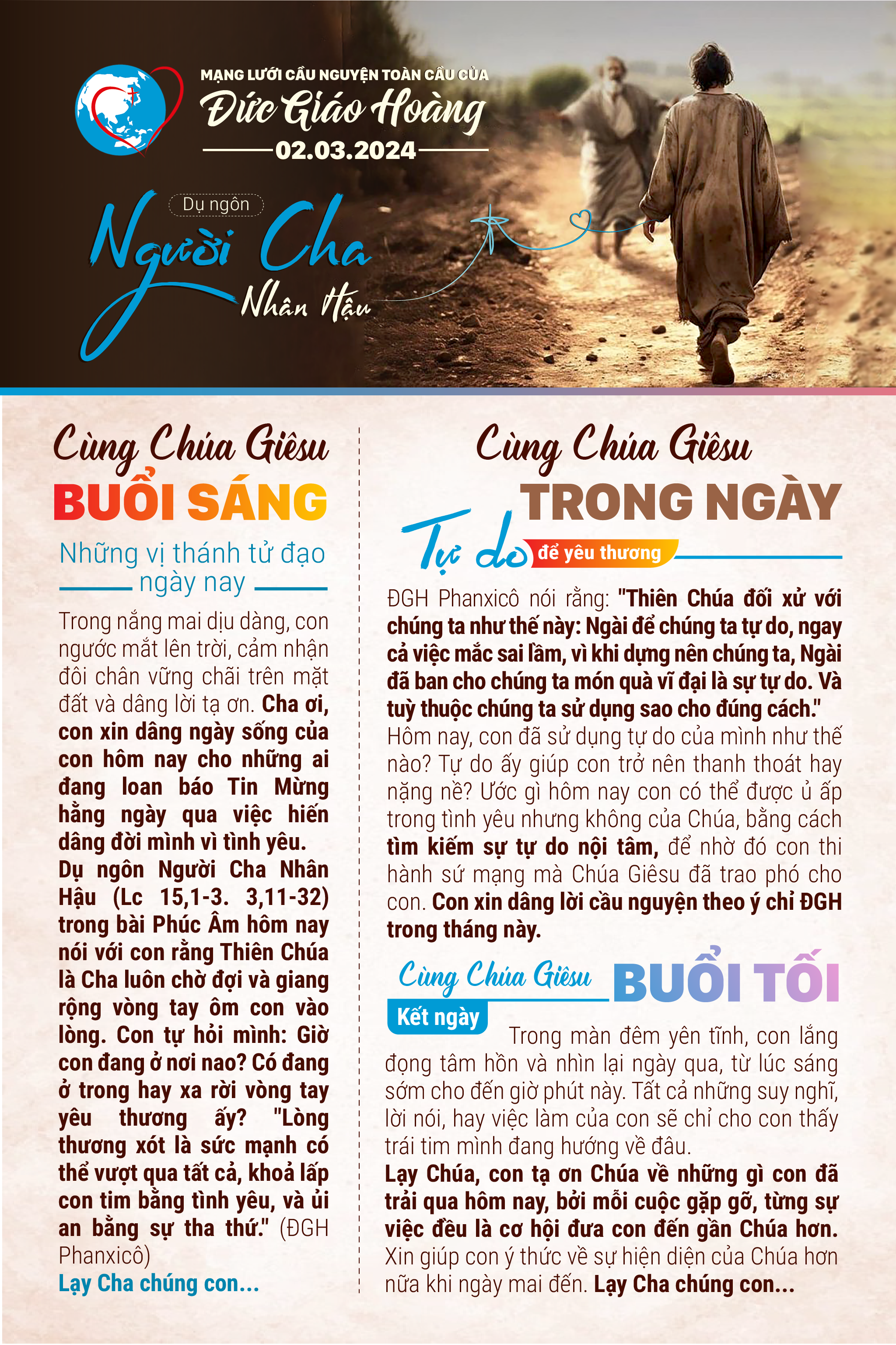 Dụ ngôn Người Cha Nhân Hậu (Lc 15,1-3. 3,11-32) trong bài Phúc Âm hôm nay nói với con rằng Thiên Chúa là Cha luôn chờ đợi và giang rộng vòng tay ôm con vào lòng. Con tự hỏi mình: Giờ con đang ở nơi nao? Có đang ở trong hay xa rời vòng tay yêu thương ấy? “Lòng thương xót là sức mạnh có thể vượt qua tất cả, khoả lấp con tim bằng tình yêu, và ủi an bằng sự tha thứ.” (ĐGH Phanxicô) Lạy Cha chúng con…