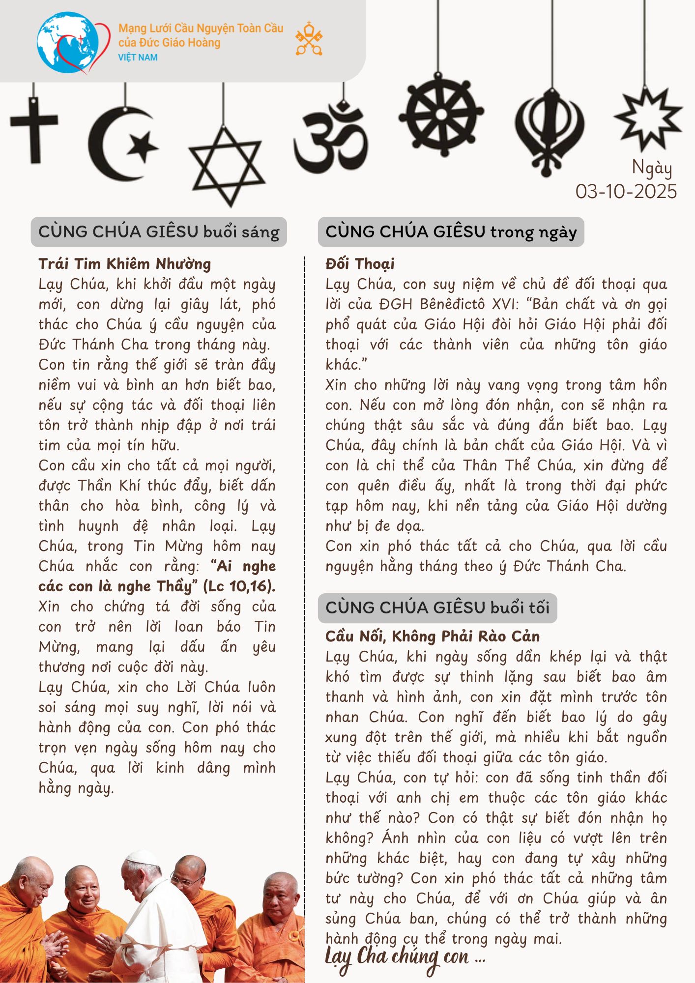 Lạy Chúa, con tự hỏi: con đã sống tinh thần đối thoại với anh chị em thuộc các tôn giáo khác như thế nào? Con có thật sự biết đón nhận họ không? Ánh nhìn của con liệu có vượt lên trên những khác biệt, hay con đang tự xây những bức tường? Con xin phó thác tất cả những tâm tư này cho Chúa, để với ơn Chúa giúp và ân sủng Chúa ban, chúng có thể trở thành những hành động cụ thể trong ngày mai.