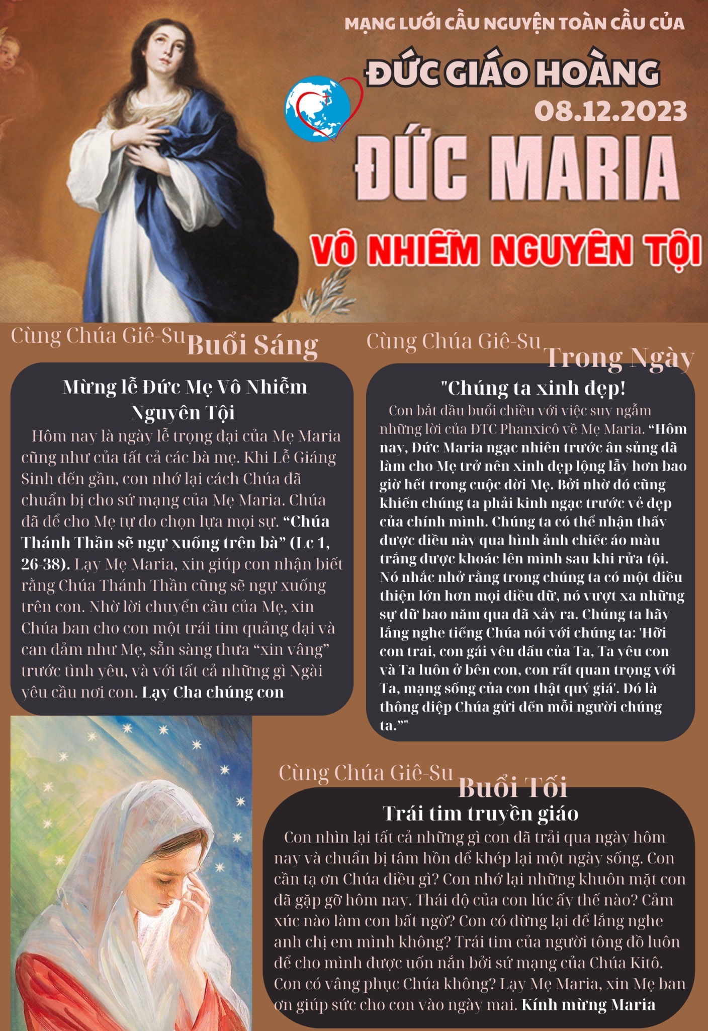Hôm nay là ngày lễ trọng đại của Mẹ Maria cũng nhưcủa tất cả các bà mẹ. Khi Lễ Giáng Sinh đến gần, con nhớ lại cách Chúa đã chuẩn bị cho sứ mạng của MẹMaria. Chúa đã để cho Mẹ tự do chọn lựa mọisự. “Chúa Thánh Thần sẽ ngự xuống trên bà” (Lc 1, 26-38). Lạy Mẹ Maria, xin giúp con nhận biết rằngChúa Thánh Thần cũng sẽ ngự xuống trên con. Nhờ lờichuyển cầu của Mẹ, xin Chúa ban cho con một trái timquảng đại và can đảm như Mẹ, sẵn sàng thưa “xinvâng” trước tình yêu, và với tất cả những gì Ngài yêucầu nơi con. Lạy Cha chúng con…