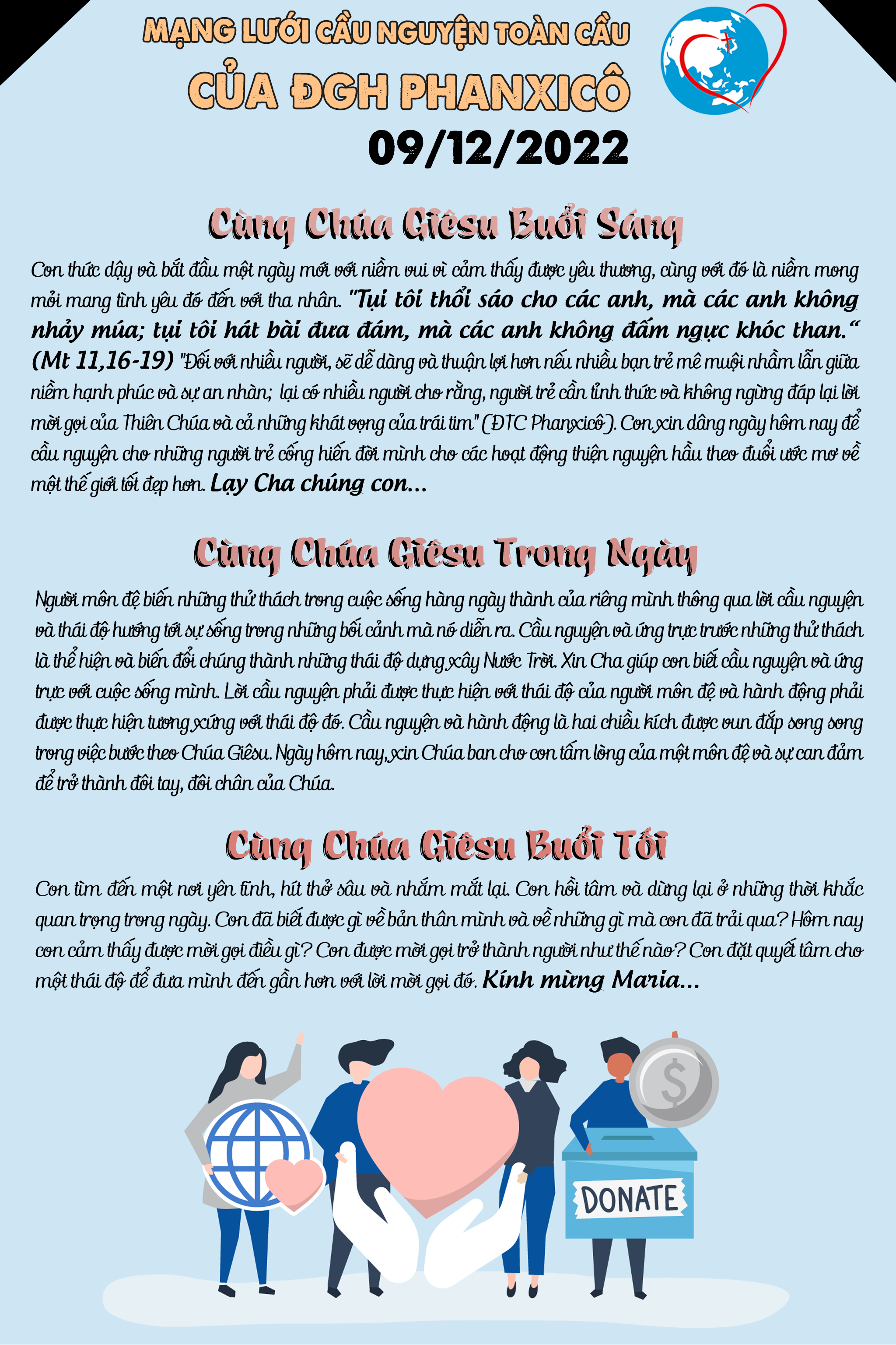 Con thức dậy và bắt đầu một ngày mới với niềm vui vì cảm thấy được yêu thương, cùng với đó là niềm mong mỏi mang tình yêu đó đến với tha nhân. “Tụi tôi thổi sáo cho các anh, mà các anh không nhảy múa; tụi tôi hát bài đưa đám, mà các anh không đấm ngực khóc than.“ (Mt 11,16-19) “Đối với nhiều người, sẽ dễ dàng và thuận lợi hơn nếu nhiều bạn trẻ mê muội nhầm lẫn giữa niềm hạnh phúc và sự an nhàn; lại có nhiều người cho rằng, người trẻ cần tỉnh thức và không ngừng đáp lại lời mời gọi của Thiên Chúa và cả những khát vọng của trái tim” (ĐTC Phanxicô). Con xin dâng ngày hôm nay để cầu nguyện cho những người trẻ cống hiến đời mình cho các hoạt động thiện nguyện hầu theo đuổi ước mơ về một thế giới tốt đẹp hơn. Lạy Cha chúng con…