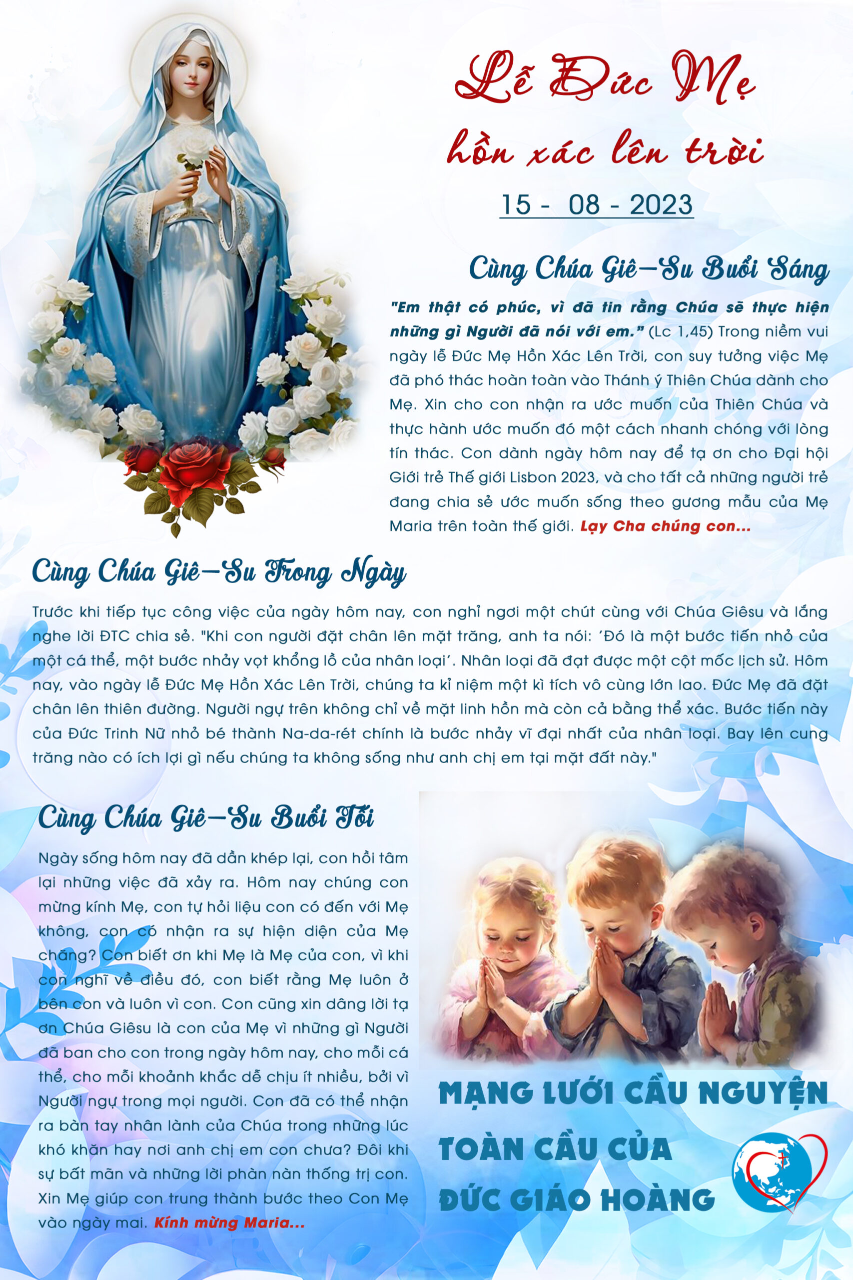 “Em thật có phúc, vì đã tin rằng Chúa sẽ thực hiện những gì Người đã nói với em.” (Lc 1,45) Trong niềm vui ngày lễ Đức Mẹ Hồn Xác Lên Trời, con suy tưởng việc Mẹ đã phó thác hoàn toàn vào Thánh ý Thiên Chúa dành cho Mẹ. Xin cho con nhận ra ước muốn của Thiên Chúa và thực hành ước muốn đó một cách nhanh chóng với lòng tín thác. Con dành ngày hôm nay để tạ ơn cho Đại hội Giới trẻ Thế giới Lisbon 2023, và cho tất cả những người trẻ đang chia sẻ ước muốn sống theo gương mẫu của Mẹ Maria trên toàn thế giới. Lạy Cha chúng con…