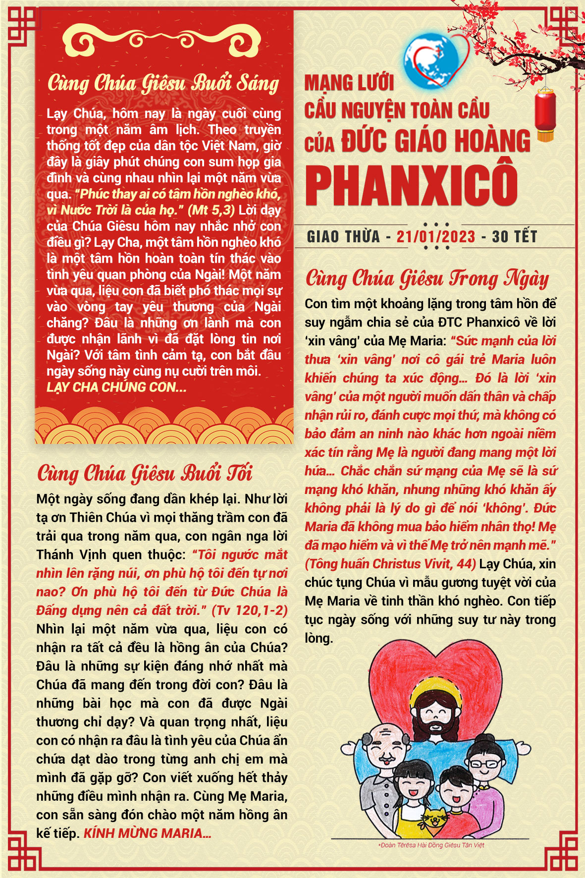 Lạy Cha, khởi đầu ngày cuối cùng của năm Âm lịch này, con dâng lời tạ ơn Cha vì muôn ơn lành lớn nhỏ Cha hằng ban xuống trên con. Theo truyền thống tốt đẹp của dân tộc Việt, những giây phút cuối năm, chúng con được sum vầy bên nhau trong gia đình và cùng nhìn lại một năm vừa qua. “Phúc thay ai có tâm hồn nghèo khó, vì Nước Trời là của họ.” (Mt 5,3) Tâm hồn nghèo khó là tâm hồn hoàn toàn tín thác vào tình yêu quan phòng của Thiên Chúa! Với tinh thần của mối phúc này, chúng con có được sự bình an sâu thẳm. Trong năm qua, liệu con có phó thác mọi sự trong vòng tay yêu thương của Cha không? Đâu là những ơn lành mà con đã nhận được. Nhìn lại một năm, con cảm nghiệm những ân tình Cha ban “quá dư đầy không còn chi hơn.” Với tâm tình cảm tạ, con dâng lên Cha ngày sống để cầu nguyện theo ý ĐGH cho những nhà giáo dục. Lạy Cha chúng con…