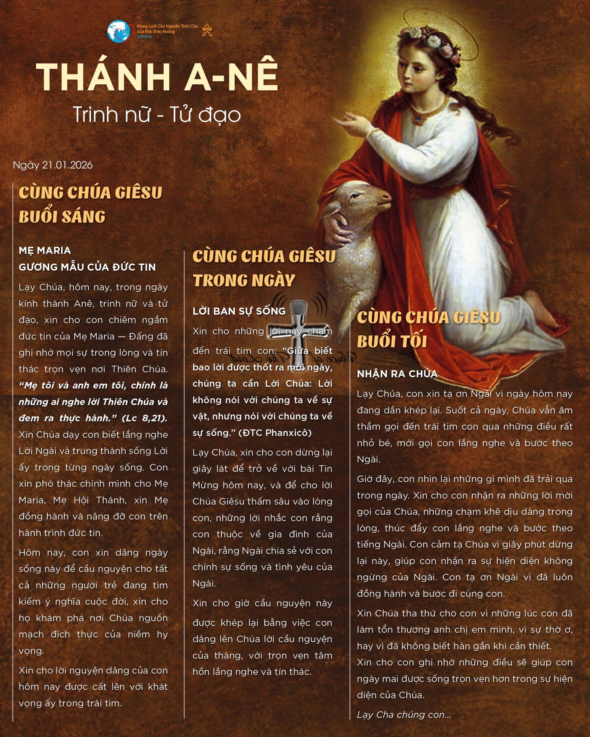Lạy Chúa, hôm nay, trong ngày kính thánh Anê, trinh nữ và tử đạo, xin cho con chiêm ngắm đức tin của Mẹ Maria — Đấng đã ghi nhớ mọi sự trong lòng và tín thác trọn vẹn nơi Thiên Chúa. “Mẹ tôi và anh em tôi, chính là những ai nghe lời Thiên Chúa và đem ra thực hành.” (Lc 8,21). Xin Chúa dạy con biết lắng nghe Lời Ngài và trung thành sống Lời ấy trong từng ngày sống. Con xin phó thác chính mình cho Mẹ Maria, Mẹ Hội Thánh, xin Mẹ đồng hành và nâng đỡ con trên hành trình đức tin.