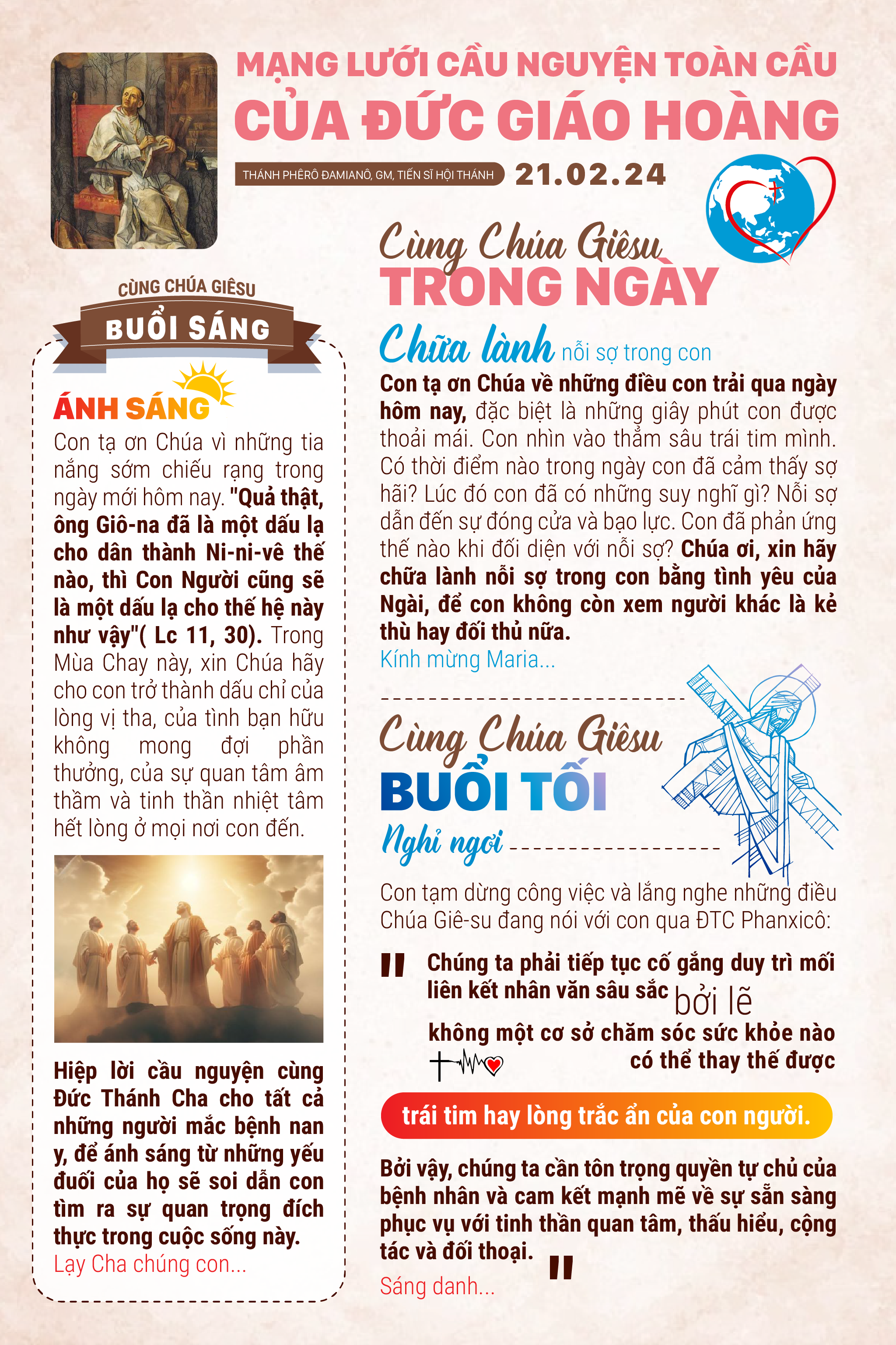Con tạ ơn Chúa vì những tia nắng sớm chiếu rạng trong ngày mới hôm nay. “Quả thật, ông Giô-na đã là một dấu lạ cho dân thành Ni-ni-vê thế nào, thì Con Người cũng sẽ là một dấu lạ cho thế hệ này như vậy” (Lc 11, 30). Trong Mùa Chay này, xin Chúa hãy cho con trở thành dấu chỉ của lòng vị tha, của tình bạn hữu không mong đợi phần thưởng, của sự quan tâm âm thầm và tinh thần nhiệt tâm hết lòng ở mọi nơi con đến. Hiệp lời cầu nguyện cùng Đức Thánh Cha cho tất cả những người mắc bệnh nan y, để ánh sáng từ những yếu đuối của họ sẽ soi dẫn con tìm ra sự quan trọng đích thực trong cuộc sống này. Lạy Cha chúng con…