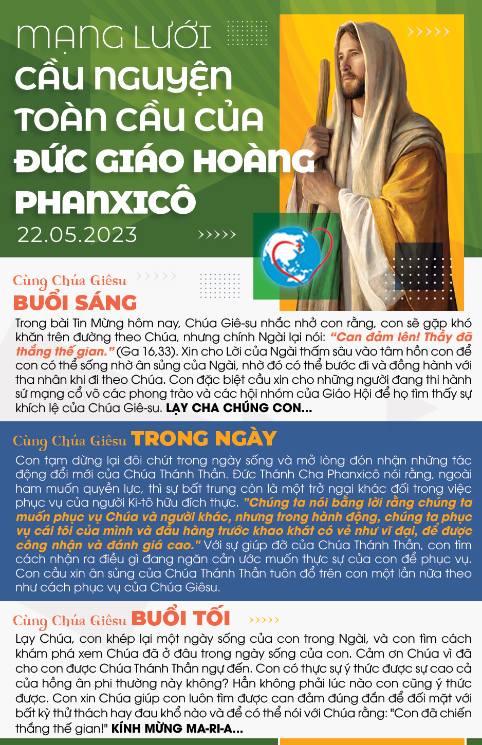 Trong bài Tin Mừng hôm nay, Chúa Giê-su nhắc nhở con rằng, con sẽ gặp khó khăn trên đường theo Chúa, nhưng chính Ngài lại nói: “Can đảm lên! Thầy đã thắng thế gian.” (Ga 16,33). Xin cho Lời của Ngài thấm sâu vào tâm hồn con để con có thể sống nhờ ân sủng của Ngài, nhờ đó có thể bước đi và đồng hành với tha nhân khi đi theo Chúa. Con đặc biệt cầu xin cho những người đang thi hành sứ mạng cổ võ các phong trào và các hội nhóm của Giáo Hội để họ tìm thấy sự khích lệ của Chúa Giê-su. Lạy Cha chúng con…
