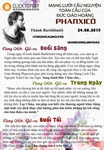 Trong ngày lễ kính thánh Batôlômêô tông đồ hôm nay, con cảm tạ vì Ngài như một món quà của Giáo hội. Xin cho con có thể tìm thấy Ngài trong những gương mặt của tha nhân, để con phục vụ và đồng hành với họ trong những khó khăn mà họ đang gặp phải. Con xin dâng ngày sống hôm nay và khao khát của con, để cùng cầu nguyện theo ý chỉ mà Đức Giáo Hoàng Phanxicô giao phó trong tháng này cho Mạng Lưới Cầu Nguyện Toàn Cầu của Ngài. Sáng danh Đức Chúa cha…
