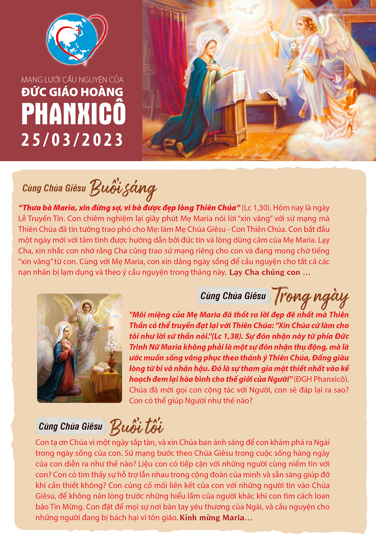 “Thưa bà Maria, xin đừng sợ, vì bà được đẹp lòng Thiên Chúa” (Lc 1,30). Hôm nay là ngày Lễ Truyền Tin. Con chiêm nghiệm lại giây phút Mẹ Maria nói lời “xin vâng” với sứ mạng mà Thiên Chúa đã tin tưởng trao phó cho Mẹ: làm Mẹ Chúa Giêsu – Con Thiên Chúa. Con bắt đầu một ngày mới với tâm tình được hướng dẫn bởi đức tin và lòng dũng cảm của Mẹ Maria. Lạy Cha, xin nhắc con nhớ rằng Cha cũng trao sứ mạng riêng cho con và đang mong chờ tiếng “xin vâng” từ con. Cùng với Mẹ Maria, con xin dâng ngày sống để cầu nguyện cho tất cả các nạn nhân bị lạm dụng và theo ý cầu nguyện trong tháng này. Lạy Cha chúng con …