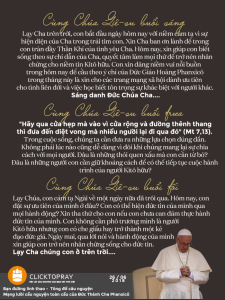 “Hãy qua cửa hẹp mà vào vì cửa rộng và đường thênh thang thì đưa đến diệt vong mà nhiều người lại đi qua đó” (Mt 7,13). Trong cuộc sống, chúng ta cần đưa ra những lựa chọn đúng đắn. Không phải lúc nào cũng dễ dàng vì đôi khi chúng mang lại sự chia cách với mọi người. Đâu là những thói quen xấu mà con cần từ bỏ? Đâu là những người con cần giữ khoảng cách để có thể tiếp tục cuộc hành trình của người Kitô hữu?