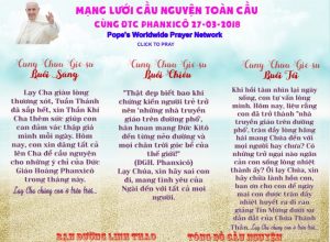 Lạy Cha giàu lòng thương xót, Tuần Thánh đã sắp hết, xin Thần Khí Cha thêm sức giúp con can đảm vác thập giá mình mỗi ngày. Hôm nay, con xin dâng tất cả lên Cha để cầu nguyện cho những ý chỉ của Đức Giáo Hoàng Phanxicô trong tháng này. Lạy Cha chúng con ở trên trời…