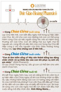 Lạy Cha trên trời, con bắt đầu ngày mới trong sự hiện diện của Cha. Xin chỉ cho con con đường mà con có thể song hành cùng Cha và nên người cộng tác vào sứ mệnh lòng thương xót của Cha. Con xin dâng mọi suy nghĩ, mọi lời nguyện xin, cùng tất cả việc làm của con trong tay Cha để hiệp cùng ý chỉ cầu nguyện của Đức Giáo Hoàng trong tháng này. Lạy Cha chúng con ở trên trời….