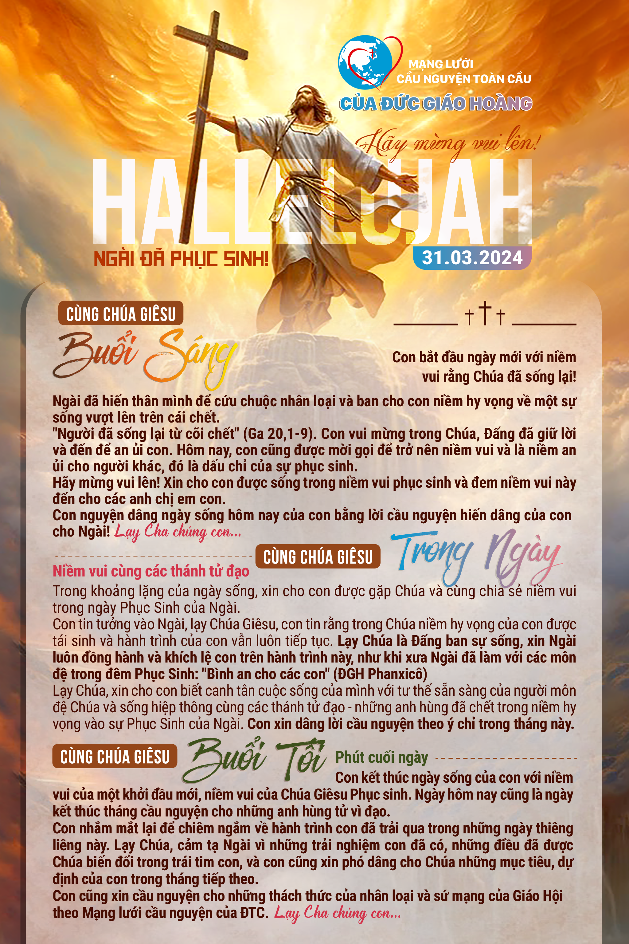 Con tin tưởng vào Ngài, lạy Chúa Giêsu, con tin rằng trong Chúa niềm hy vọng của con được tái sinh và hành trình của con vẫn luôn tiếp tục. Lạy Chúa là Đấng ban sự sống, xin Ngài luôn đồng hành và khích lệ con trên hành trình này, như khi xưa Ngài đã làm với các môn đệ trong đêm Phục Sinh:“Bình an cho các con” (ĐGH Phanxicô)