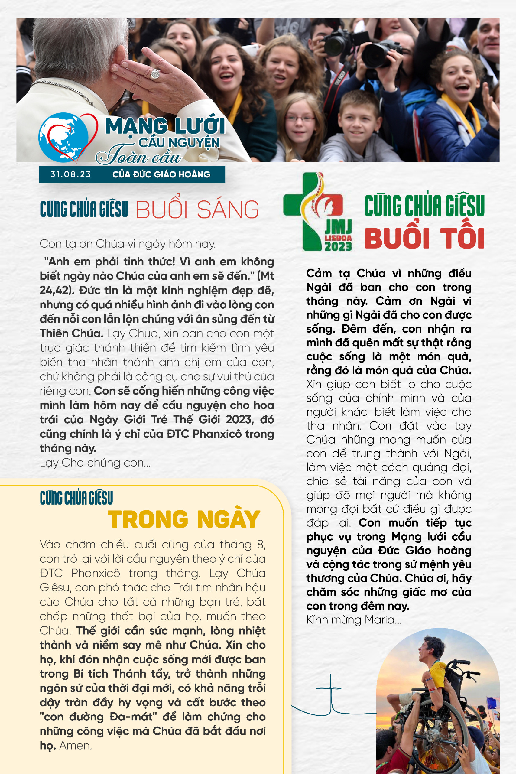 Vào chớm chiều cuối cùng của tháng 8, con trở lại với lời cầu nguyện theo ý chỉ của ĐTC Phanxicô trong tháng. Lạy Chúa Giêsu, con phó thác cho Trái tim nhân hậu của Chúa cho tất cả những bạn trẻ, bất chấp những thất bại của họ, muốn theo Chúa. Thế giới cần sức mạnh, lòng nhiệt thành và niềm say mê như Chúa. Xin cho họ, khi đón nhận cuộc sống mới được ban trong Bí tích Thánh tẩy, trở thành những ngôn sứ của thời đại mới, có khả năng trỗi dậy tràn đầy hy vọng và cất bước theo “con đường Đa-mát” để làm chứng cho những công việc mà Chúa đã bắt đầu nơi họ. Amen.