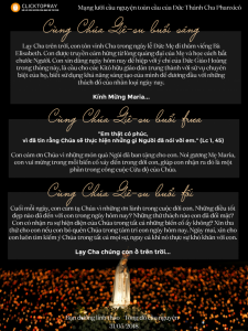“Em thật có phúc, vì đã tin rằng Chúa sẽ thực hiện những gì Người đã nói với em.” (Lc 1, 45) Con cám ơn Chúa vì những món quà Ngài đã ban tặng cho con. Noi gương Mẹ Maria, con vui mừng trong mỗi biến cố xảy đến trong đời con, giúp con nhận ra đó là một phần trong công cuộc Cứu độ của Chúa.