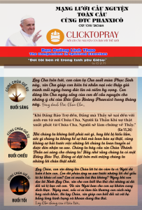 Lạy Cha trên trời, con cảm tạ Cha suốt mùa Phục Sinh này, xin Cha giúp con kiên trì nhẫn nại vác thập giá mình mỗi ngày trong đức tin và niềm hy vọng. Con dâng lên Cha ngày sống của con để cầu nguyện cho những ý chỉ của Đức Giáo Hoàng Phanxicô trong tháng này. Sáng danh Đức Chúa Cha…