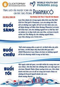 Lạy Cha nhân từ, trong ngày đầu tiên của Đại Hội Giới trẻ Thế giới ở Panama, con xin dâng lên Cha tất cả những suy nghĩ, lời nói và việc làm của con, để hiệp thông với Đức Giáo Hoàng Phanxicô và toàn thể Giáo hội, xin cho những người trẻ có thể học hỏi và nhận ra vẻ đẹp tình yêu của Cha, và loan truyền niềm vui Tin Mừng ấy cho những người khác. Lạy Cha chúng con ở trên trời…