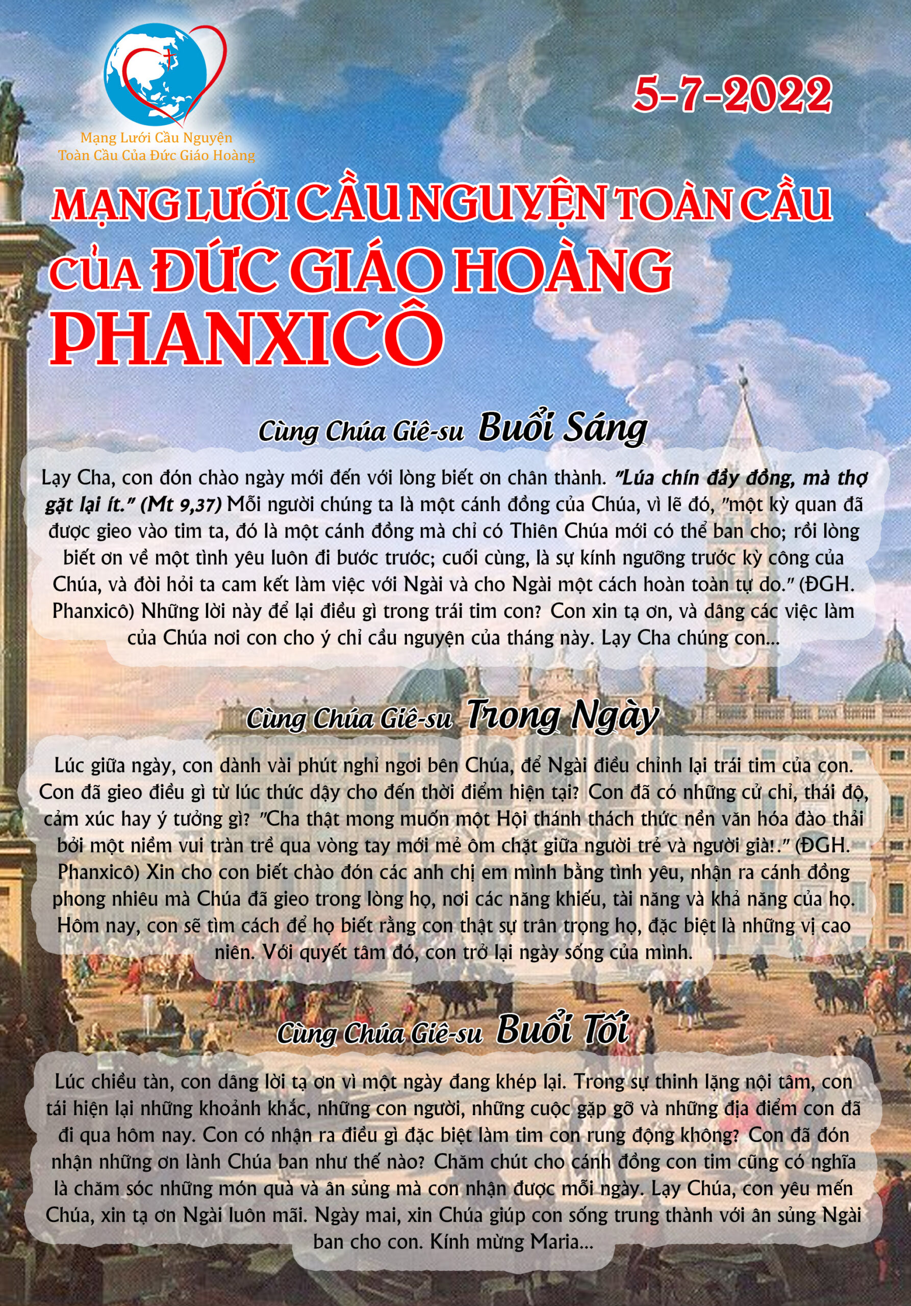 Lạy Cha, con đón chào ngày mới đến với lòng biết ơn chân thành. “Lúa chín đầy đồng, mà thợ gặt lại ít.” (Mt 9,37) Mỗi người chúng ta là một cánh đồng của Chúa, vì lẽ đó, “một kỳ quan đã được gieo vào tim ta, đó là một cánh đồng mà chỉ có Thiên Chúa mới có thể ban cho; rồi lòng biết ơn về một tình yêu luôn đi bước trước; cuối cùng, là sự kính ngưỡng trước kỳ công của Chúa, và đòi hỏi ta cam kết làm việc với Ngài và cho Ngài một cách hoàn toàn tự do.” (ĐGH. Phanxicô) Những lời này để lại điều gì trong trái tim con? Con xin tạ ơn, và dâng các việc làm của Chúa nơi con cho ý chỉ cầu nguyện của tháng này. Lạy Cha chúng con…