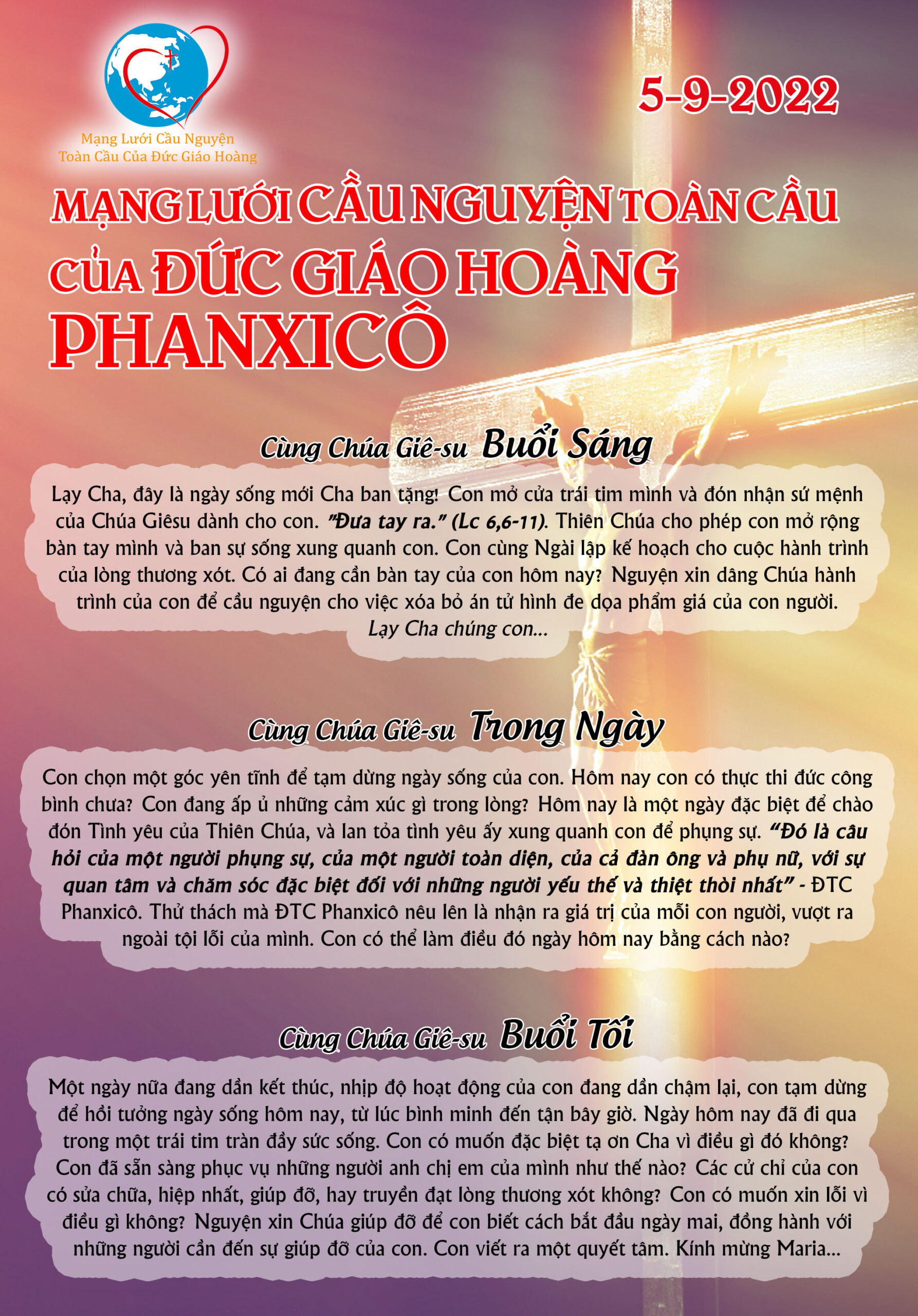Lạy Cha, đây là ngày sống mới Cha ban tặng! Con mở cửa trái tim mình và đón nhận sứ mệnh của Chúa Giêsu dành cho con. “Đưa tay ra.” (Lc 6,6-11). Thiên Chúa cho phép con mở rộng bàn tay mình và ban sự sống xung quanh con. Con cùng Ngài lập kế hoạch cho cuộc hành trình của lòng thương xót. Có ai đang cần bàn tay của con hôm nay? Nguyện xin dâng Chúa hành trình của con để cầu nguyện cho việc xóa bỏ án tử hình đe dọa phẩm giá của con người. Lạy Cha chúng con...