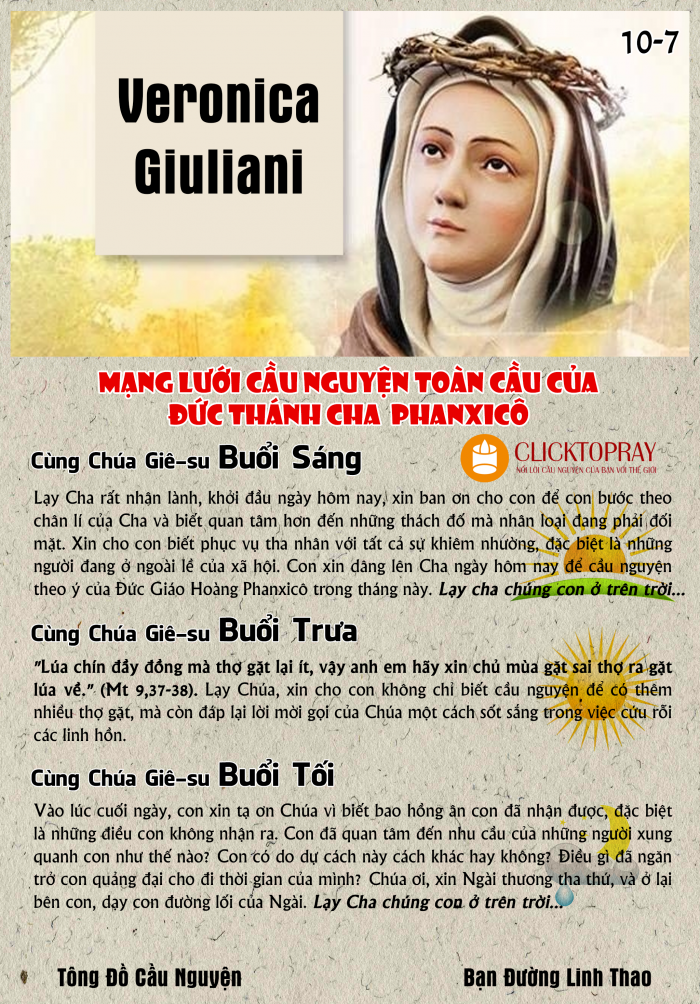 Lạy Cha rất nhân lành, khởi đầu ngày hôm nay, xin ban ơn cho con để con bước theo chân lí của Cha và biết quan tâm hơn đến những thách đố mà nhân loại đang phải đối mặt. Xin cho con biết phục vụ tha nhân với tất cả sự khiêm nhường, đặc biệt là những người đang ở ngoài lề của xã hội. Con xin dâng lên Cha ngày hôm nay để cầu nguyện theo ý của Đức Giáo Hoàng Phanxicô trong tháng này. Lạy cha chúng con ở trên trời…