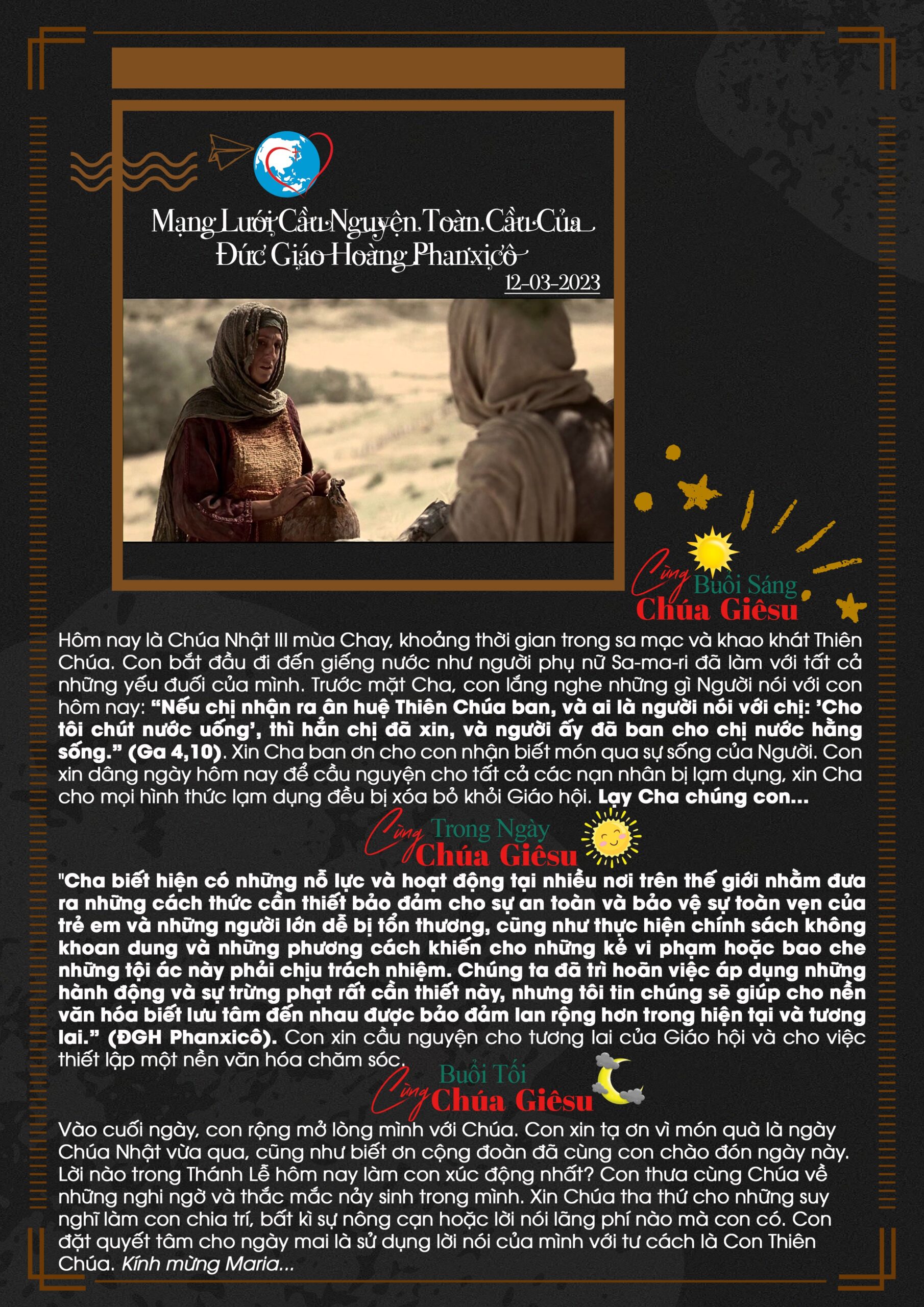 Hôm nay là Chúa Nhật III mùa Chay, khoảng thời gian trong sa mạc và khao khát Thiên Chúa. Con bắt đầu đi đến giếng nước như người phụ nữ Sa-ma-ri đã làm với tất cả những yếu đuối của mình. Trước mặt Cha, con lắng nghe những gì Người nói với con hôm nay: “Nếu chị nhận ra ân huệ Thiên Chúa ban, và ai là người nói với chị: ‘Cho tôi chút nước uống’, thì hẳn chị đã xin, và người ấy đã ban cho chị nước hằng sống.” (Ga 4,10). Xin Cha ban ơn cho con nhận biết món qua sự sống của Người. Con xin dâng ngày hôm nay để cầu nguyện cho tất cả các nạn nhân bị lạm dụng, xin Cha cho mọi hình thức lạm dụng đều bị xóa bỏ khỏi Giáo hội. Lạy Cha chúng con…