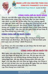 Cha ơi, con bắt đầu ngày sống này bằng cách đặt mình tĩnh lặng trước nhan Cha. Xin thúc đẩy con làm những việc phục vụ nhỏ bé, và tìm thấy Cha nơi những người con gặp gỡ. Hôm nay, con xin dâng lên Cha trái tim và tất cả con người của con. Xin Chúa Thánh Thần đến ở lại trong con và giúp con cầu nguyện theo ý Đức Giáo Hoàng trong tháng này – cầu cho các tôn giáo thiểu số tại Châu Á. Lạy Cha chúng con ở trên trời…