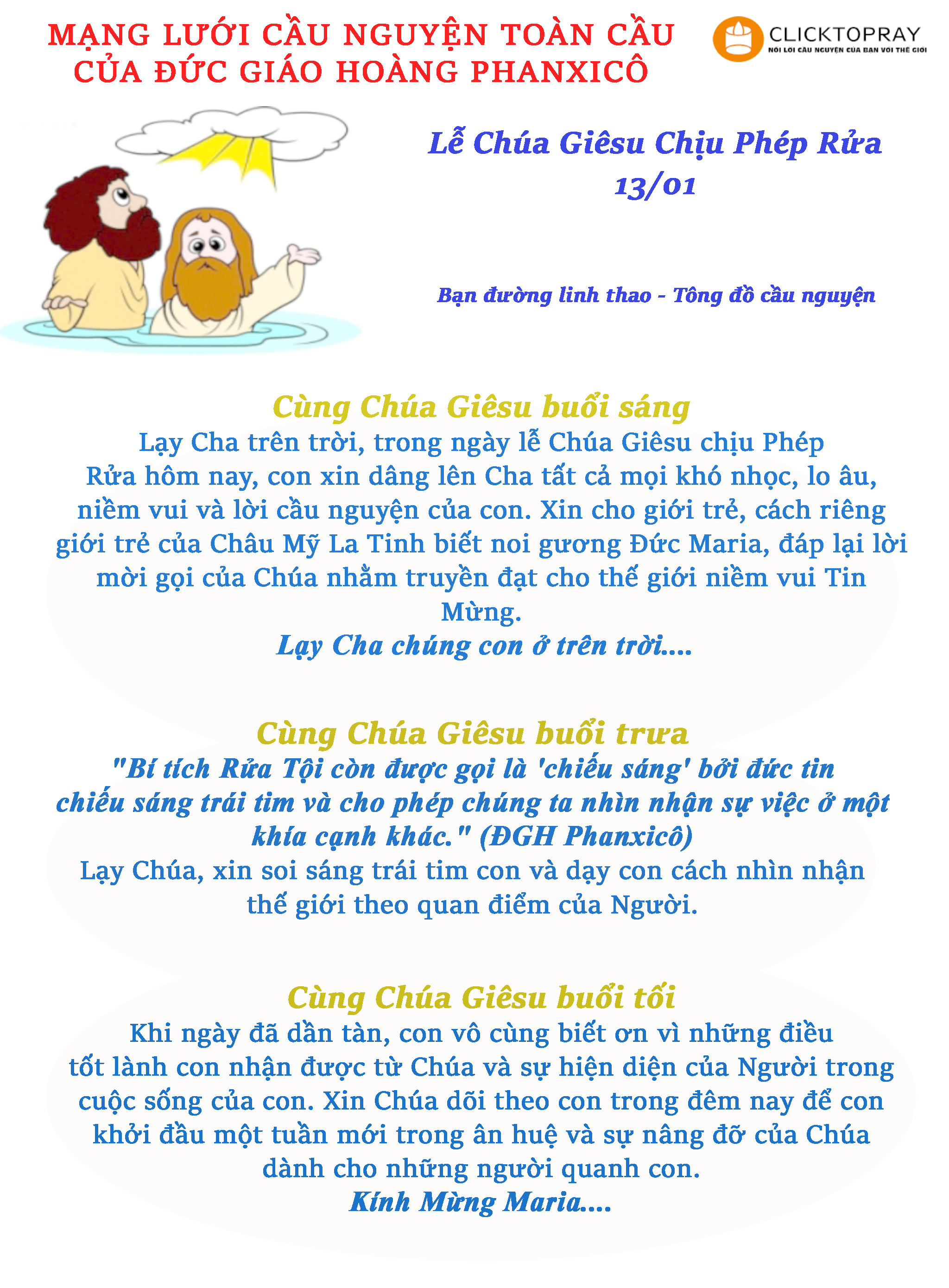 Lạy Cha trên trời, trong ngày lễ Chúa Giêsu chịu Phép Rửa hôm nay, con xin dâng lên Cha tất cả mọi khó nhọc, lo âu, niềm vui và lời cầu nguyện của con. Xin cho giới trẻ, cách riêng giới trẻ của Châu Mỹ La Tinh biết noi gương Đức Maria, đáp lại lời mời gọi của Chúa nhằm truyền đạt cho thế giới niềm vui Tin Mừng. Lạy Cha chúng con ở trên trời….