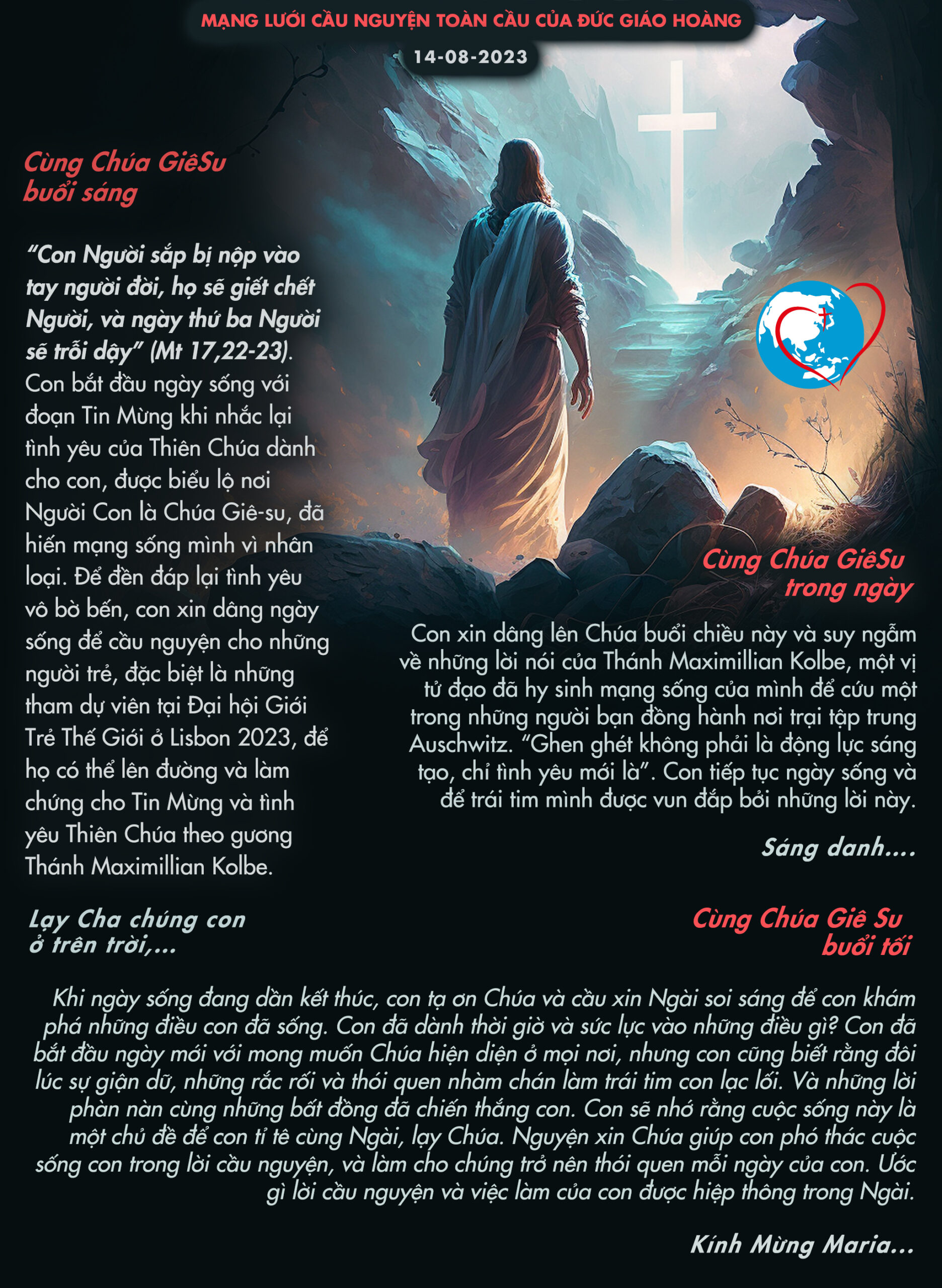 “Con Người sắp bị nộp vào tay người đời, họ sẽ giết chết Người, và ngày thứ ba Người sẽ trỗi dậy” (Mt 17,22-23). Con bắt đầu ngày sống với đoạn Tin Mừng khi nhắc lại tình yêu của Thiên Chúa dành cho con, được biểu lộ nơi Người Con là Chúa Giê-su, đã hiến mạng sống mình vì nhân loại. Để đền đáp lại tình yêu vô bờ bến, con xin dâng ngày sống để cầu nguyện cho những người trẻ, đặc biệt là những tham dự viên tại Đại hội Giới Trẻ Thế Giới ở Lisbon 2023, để họ có thể lên đường và làm chứng cho Tin Mừng và tình yêu Thiên Chúa theo gương Thánh Maximillian Kolbe. Lạy Cha chúng con…