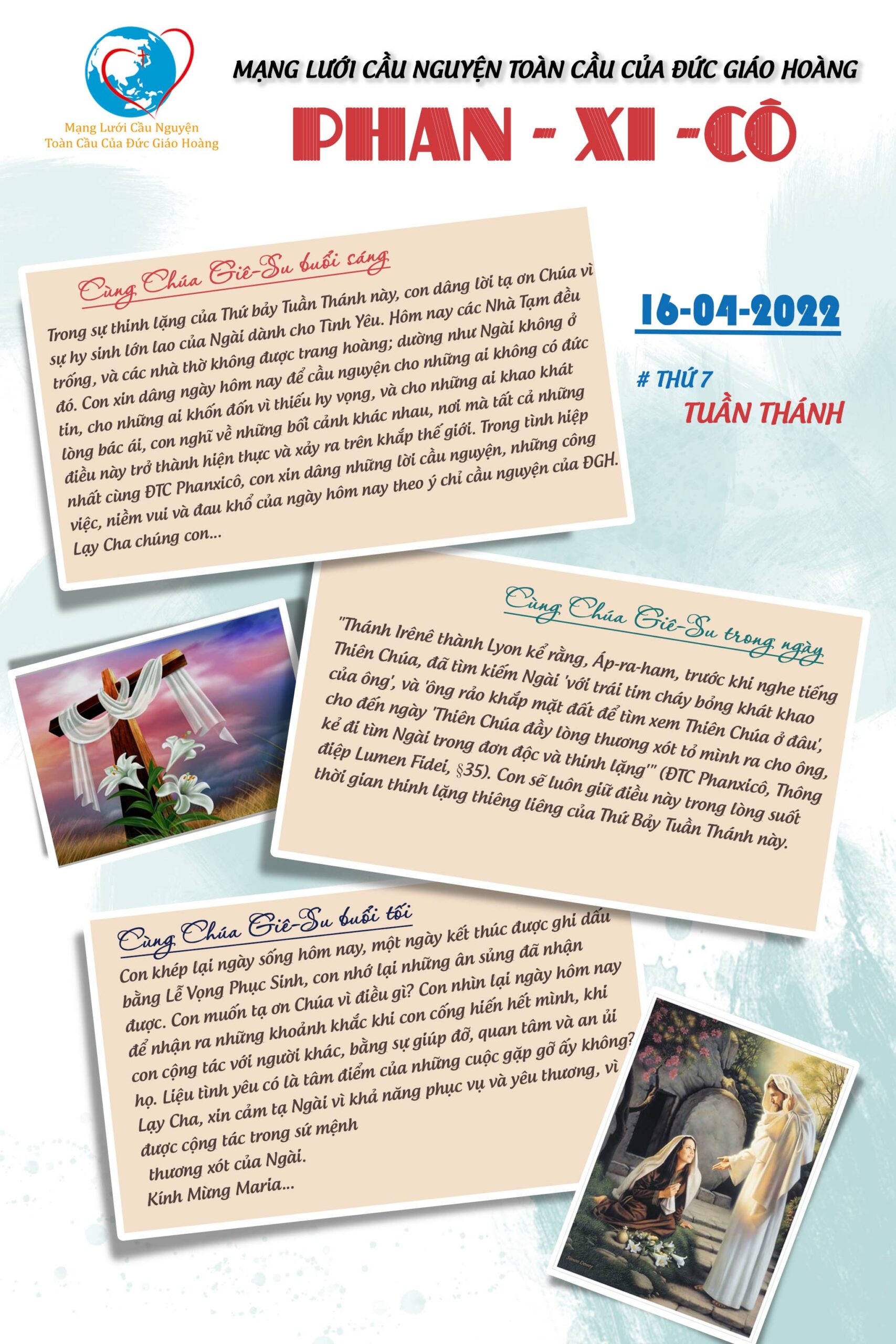 Trong sự thinh lặng của Thứ bảy Tuần Thánh này, con dâng lời tạ ơn Chúa vì sự hy sinh lớn lao của Ngài dành cho Tình Yêu. Hôm nay các Nhà Tạm đều trống, và các nhà thờ không được trang hoàng; dường như Ngài không ở đó. Con xin dâng ngày hôm nay để cầu nguyện cho những ai không có đức tin, cho những ai khốn đốn vì thiếu hy vọng, và cho những ai khao khát lòng bác ái, con nghĩ về những bối cảnh khác nhau, nơi mà tất cả những điều này trở thành hiện thực và xảy ra trên khắp thế giới. Trong tình hiệp nhất cùng ĐTC Phanxicô, con xin dâng những lời cầu nguyện, những công việc, niềm vui và đau khổ của ngày hôm nay theo ý chỉ cầu nguyện của ĐGH. Lạy Cha chúng con…