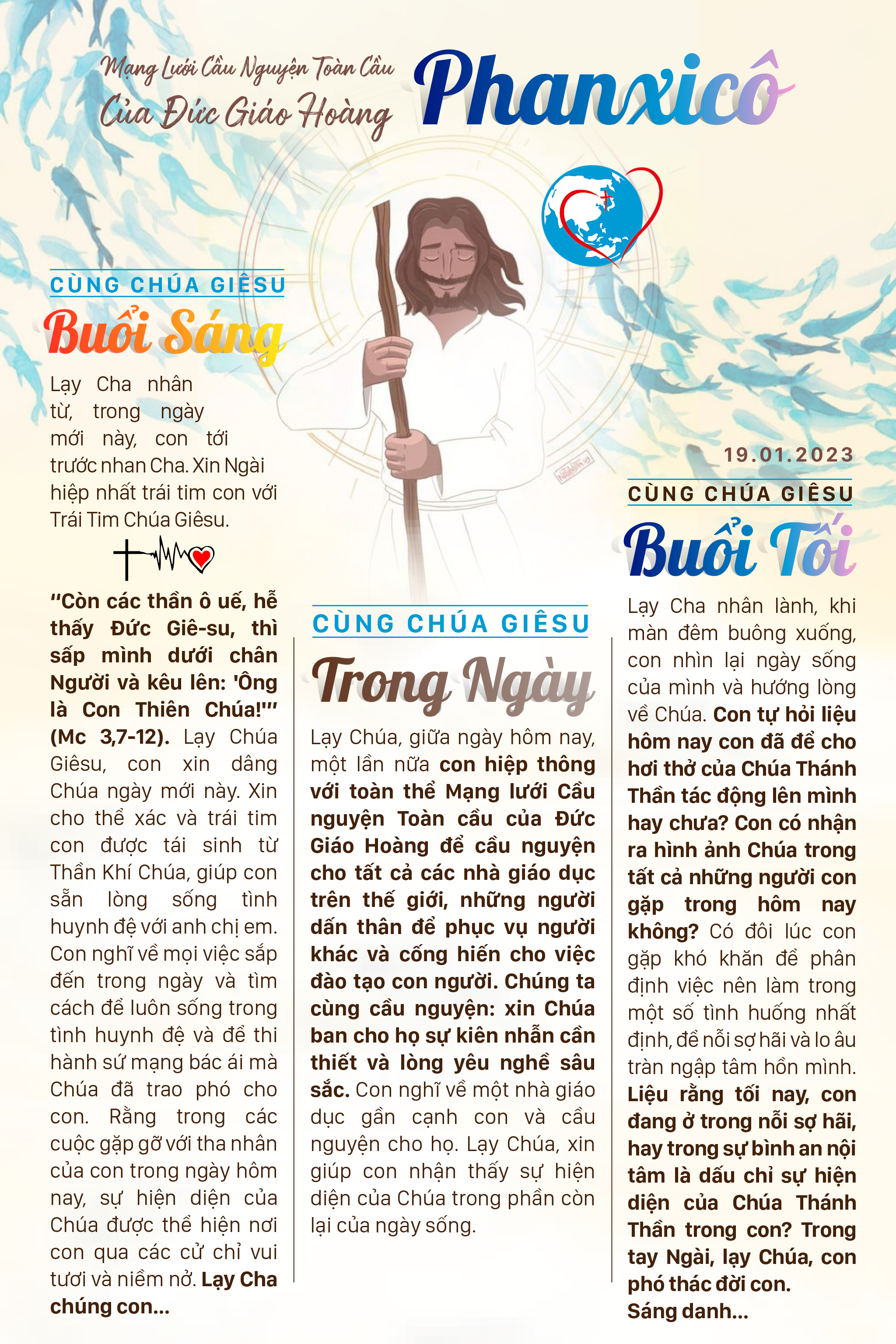 Lạy Chúa, giữa ngày hôm nay, một lần nữa con hiệp thông với toàn thể Mạng lưới Cầu nguyện Toàn cầu của Đức Giáo Hoàng để cầu nguyện cho tất cả các nhà giáo dục trên thế giới, những người dấn thân để phục vụ người khác và cống hiến cho việc đào tạo con người. Chúng ta cùng cầu nguyện: xin Chúa ban cho họ sự kiên nhẫn cần thiết và lòng yêu nghề sâu sắc. Con nghĩ về một nhà giáo dục gần cạnh con và cầu nguyện cho họ. Lạy Chúa, xin giúp con nhận thấy sự hiện diện của Chúa trong phần còn lại của ngày sống.