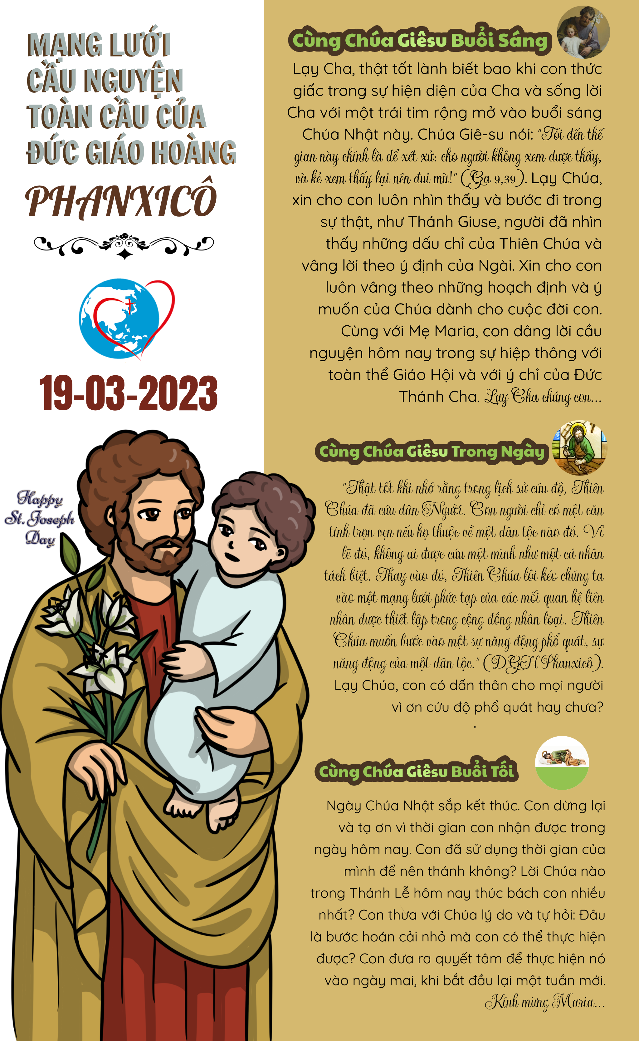 Lạy Cha, thật tốt lành biết bao khi con thức giấc trong sự hiện diện của Cha và sống lời Cha với một trái tim rộng mở vào buổi sáng Chúa Nhật này. Chúa Giê-su nói: “Tôi đến thế gian này chính là để xét xử: cho người không xem được thấy, và kẻ xem thấy lại nên đui mù!” (Ga 9,39). Lạy Chúa, xin cho con luôn nhìn thấy và bước đi trong sự thật, như Thánh Giuse, người đã nhìn thấy những dấu chỉ của Thiên Chúa và vâng lời theo ý định của Ngài. Xin cho con luôn vâng theo những hoạch định và ý muốn của Chúa dành cho cuộc đời con. Cùng với Mẹ Maria, con dâng lời cầu nguyện hôm nay trong sự hiệp thông với toàn thể Giáo Hội và với ý chỉ của Đức Thánh Cha. Lạy Cha chúng con…