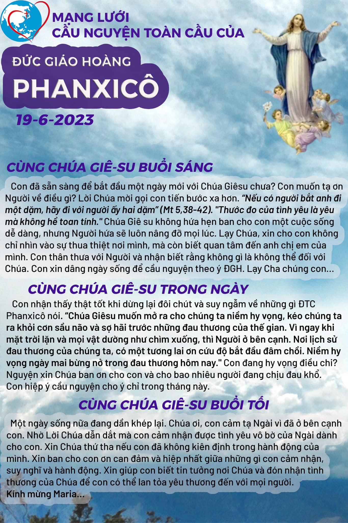 Con nhận thấy thật tốt khi dừng lại đôi chút và suy ngẫm về những gì ĐTC Phanxicô nói. “Chúa Giêsu muốn mở ra cho chúng ta niềm hy vọng, kéo chúng ta ra khỏi cơn sầu não và sợ hãi trước những đau thương của thế gian. Vì ngay khi mặt trời lặn và mọi vật dường như chìm xuống, thì Người ở bên cạnh. Nơi lịch sử đau thương của chúng ta, có một tương lai ơn cứu độ bắt đầu đâm chồi. Niềm hy vọng ngày mai bừng nở trong đau thương hôm nay.” Con đang hy vọng điều chi? Nguyện xin Chúa ban ơn cho con và cho bao nhiêu người đang chịu đau khổ. Con hiệp ý cầu nguyện cho ý chỉ trong tháng này.