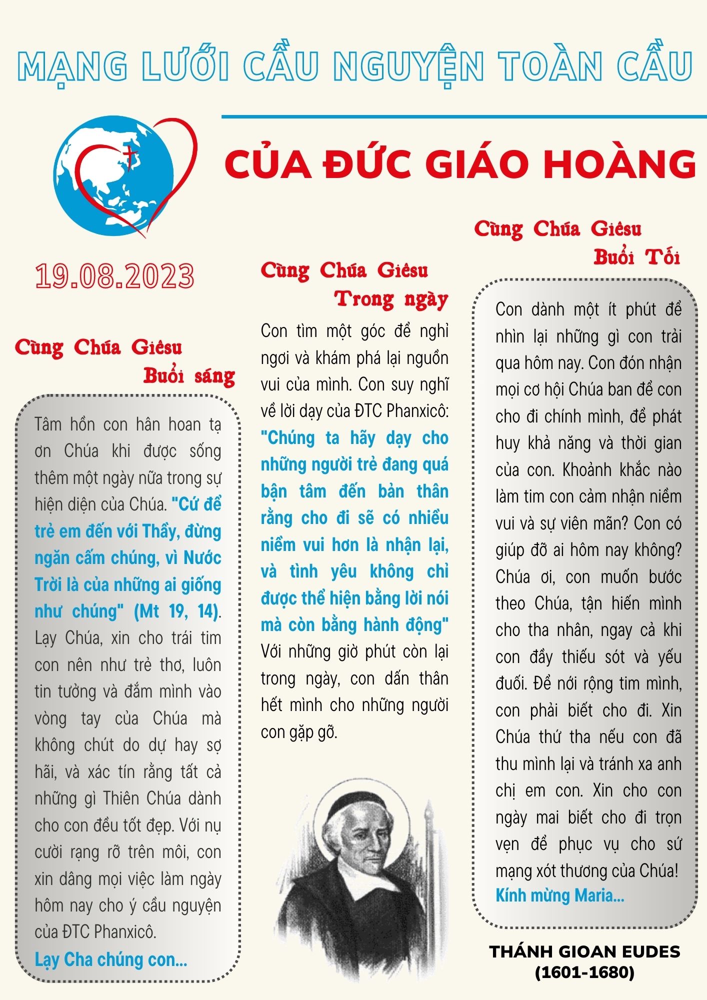 Tâm hồn con hân hoan tạ ơn Chúa khi được sống thêm một ngày nữa trong sự hiện diện của Chúa. “Cứ để trẻ em đến với Thầy, đừng ngăn cấm chúng, vì Nước Trời là của những ai giống như chúng” (Mt 19, 14). Lạy Chúa, xin cho trái tim con nên như trẻ thơ, luôn tin tưởng và đắm mình vào vòng tay của Chúa mà không chút do dự hay sợ hãi, và xác tín rằng tất cả những gì Thiên Chúa dành cho con đều tốt đẹp. Với nụ cười rạng rỡ trên môi, con xin dâng mọi việc làm ngày hôm nay cho ý cầu nguyện của ĐTC Phanxicô. Lạy Cha chúng con…