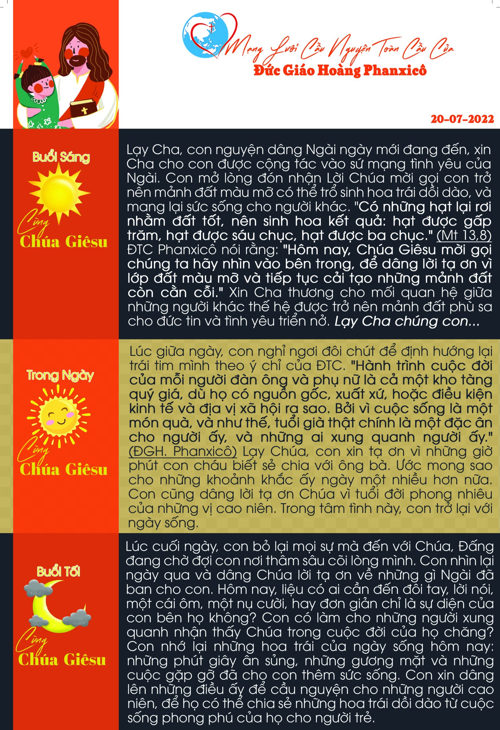 Lạy Cha, con nguyện dâng Ngài ngày mới đang đến, xin Cha cho con được cộng tác vào sứ mạng tình yêu của Ngài. Con mở lòng đón nhận Lời Chúa mời gọi con trở nên mảnh đất màu mỡ có thể trổ sinh hoa trái dồi dào, và mang lại sức sống cho người khác. “Có những hạt lại rơi nhằm đất tốt, nên sinh hoa kết quả: hạt được gấp trăm, hạt được sáu chục, hạt được ba chục.” (Mt 13,8) ĐTC Phanxicô nói rằng: “Hôm nay, Chúa Giêsu mời gọi chúng ta hãy nhìn vào bên trong, để dâng lời tạ ơn vì lớp đất màu mỡ và tiếp tục cải tạo những mảnh đất còn cằn cỗi.” Xin Cha thương cho mối quan hệ giữa những người khác thế hệ được trở nên mảnh đất phù sa cho đức tin và tình yêu triển nở. Lạy Cha chúng con…