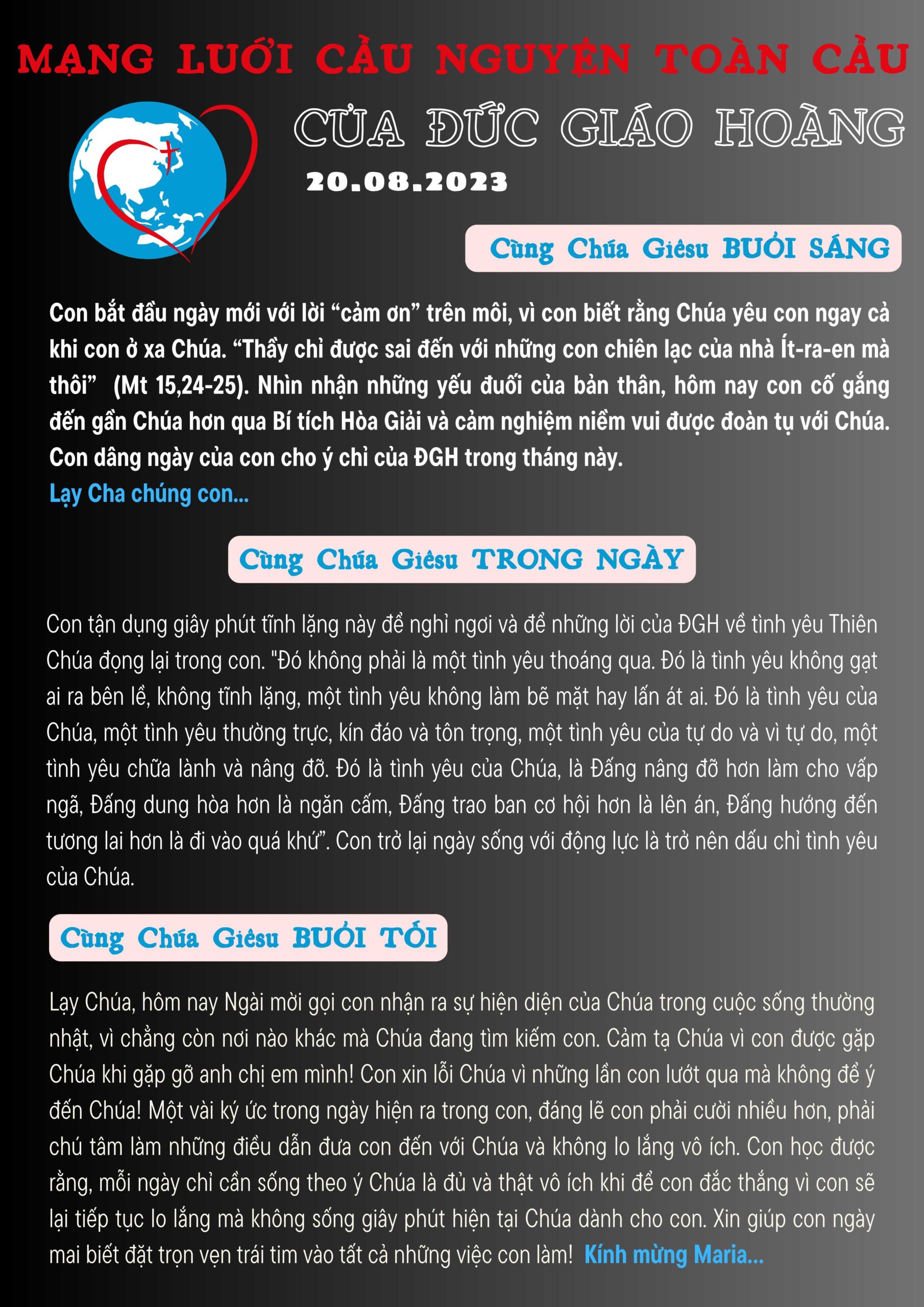 Con bắt đầu ngày mới với lời “cảm ơn” trên môi, vì con biết rằng Chúa yêu con ngay cả khi con ở xa Chúa. “Thầy chỉ được sai đến với những con chiên lạc của nhà Ít-ra-en mà thôi.” (Mt 15,24-25). Nhìn nhận những yếu đuối của bản thân, hôm nay con cố gắng đến gần Chúa hơn qua Bí tích Hòa Giải và cảm nghiệm niềm vui được đoàn tụ với Chúa. Con dâng ngày của con cho ý chỉ của ĐGH trong tháng này. Lạy Cha chúng con…